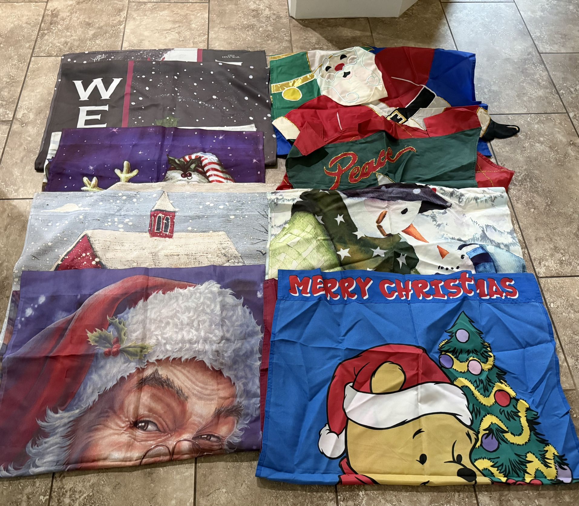 House decorative flags. I have 8 Christmas flags, 11 Fall flags, 6 spring flags and 4 misc flags for summer. Approx price of each flag ranges from $15-$25 new. 29 flags for $60- flag sizes 28x40. If individually they are $5.00 each. All in great shape. No rips. Fits outdoor flag pole for the house or boutique. If ad is up it’s available Cash or Venmo.