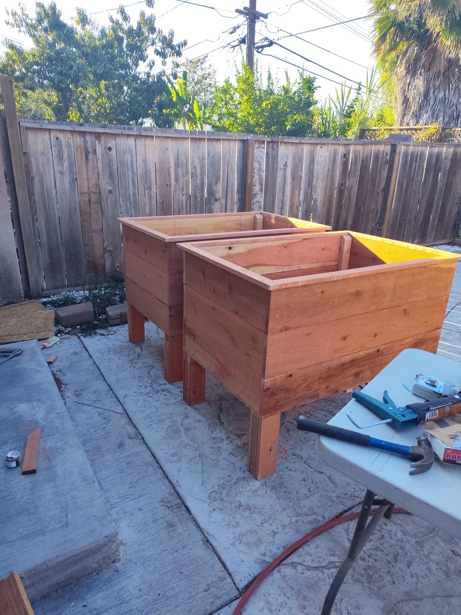 Material: Redwood Dimensions: 4 foot long 30inches wide 3 foot tall Really sturdy Great for back yard, Front house, Backyard, Gardening, Farming, Growing 250 for both Plus Delivery Fee if needed