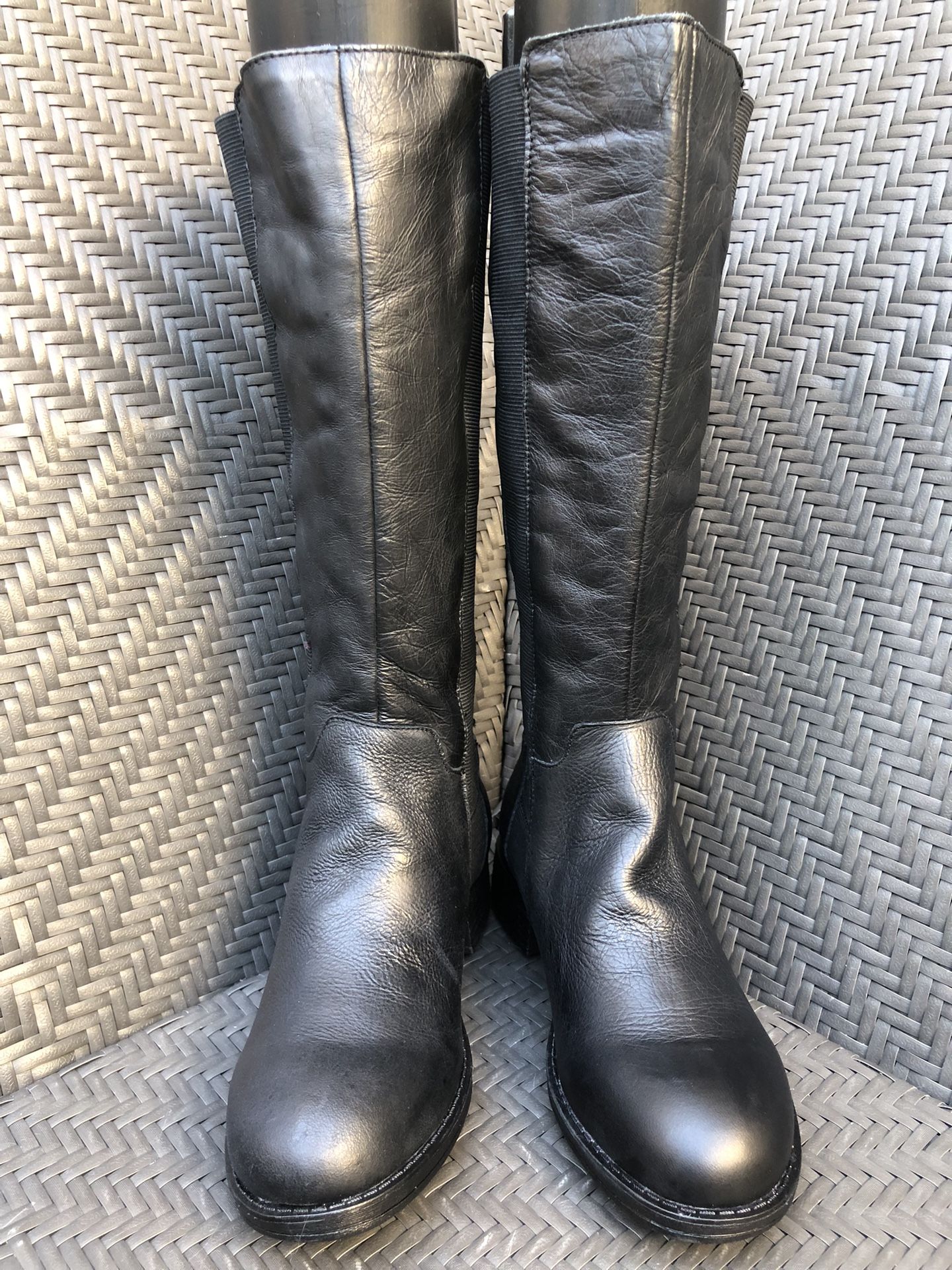 New in box Closure Type: Pull On with stretch gore Shaft Circumference: approx 14 inches Boot Shaft Height: approx 15 Inches Shoe Heel Height: approx 1 inches Leather upper/textile lining Balance man made Calf Width: Regular Toe Type: Round Toe, Closed Toe Heel Style: Stacked Heel Retail: $149.99