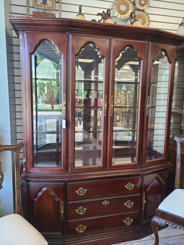 This Mahogany China Cabinet measuring at 64"L x 21'' W x 84'' H has a Mirrored Back, Four Glass Doors, Three Drawers and Two Wooden Cabinets on the bottom.