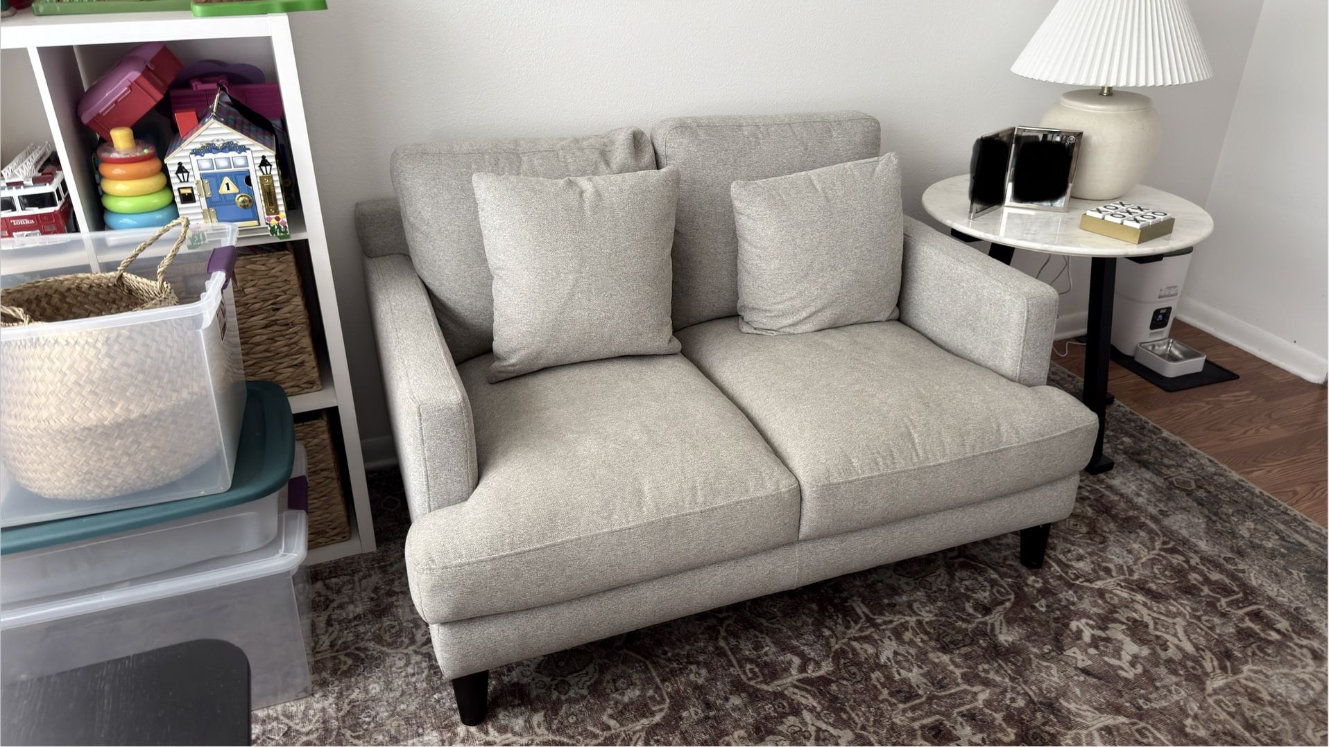 "Heavenly chrome grey" Dimensions: Approximately 62"W x 39"D x 30"H. Cushions: High-resiliency foam cushions that are reversible and removable. Build: Hardwood and pine frame with 100% polyester upholstery (durable and easy to clean). Will need to coordinate pick up. Do not own a truck or trailer to transport.