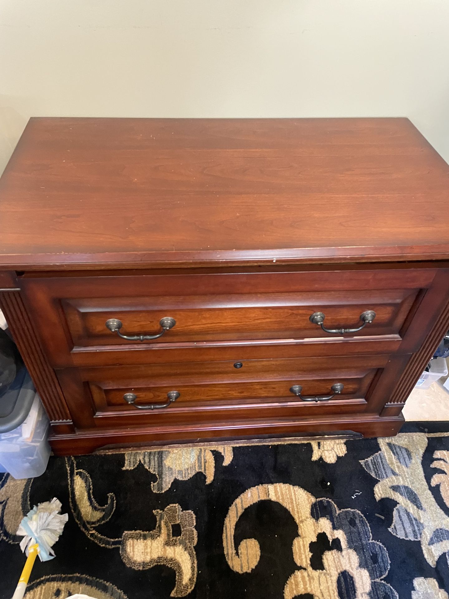 Dark wood file cabinet in good condition 22" across top 39" wide 30" tall two full drawers for hanging files Or can be removed for a dresser