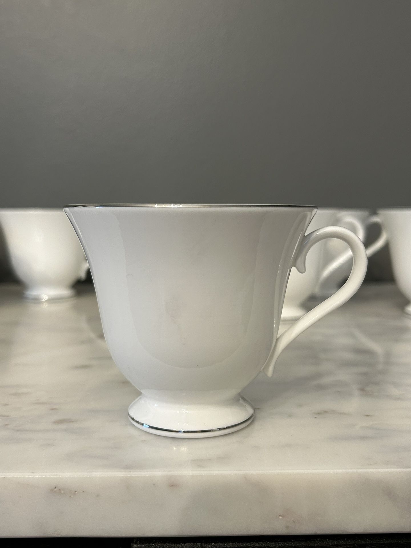 Wedgewood Signet Platinum Tea Cups. Set of eight in perfect condition with platinum trim. $80 cash and pick up only.