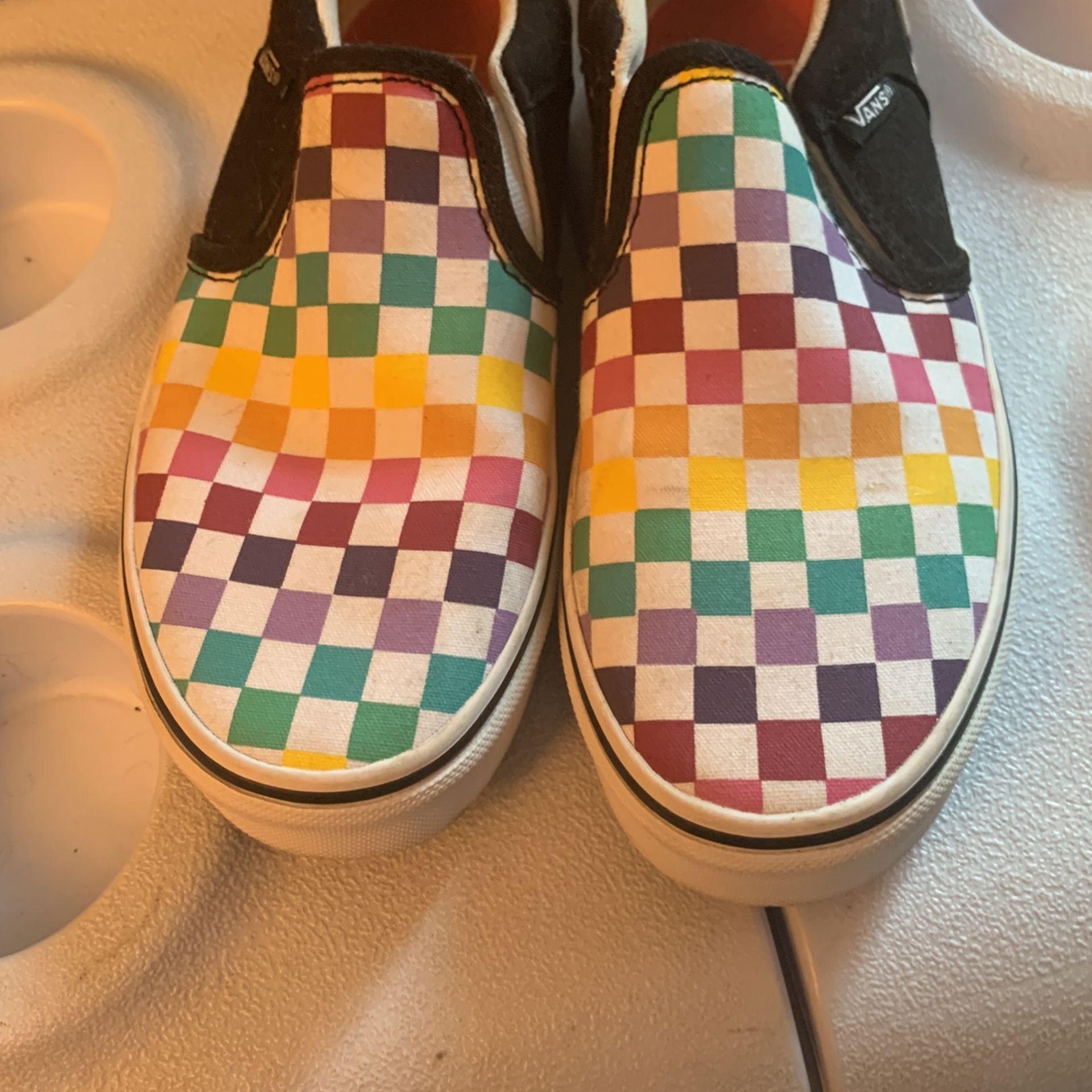 Like New, in excellent condition look brand new. only worn one time for a few hours. Multi-colored checkered Vans size 3 Youth. Sold with original box I purchased them in.
