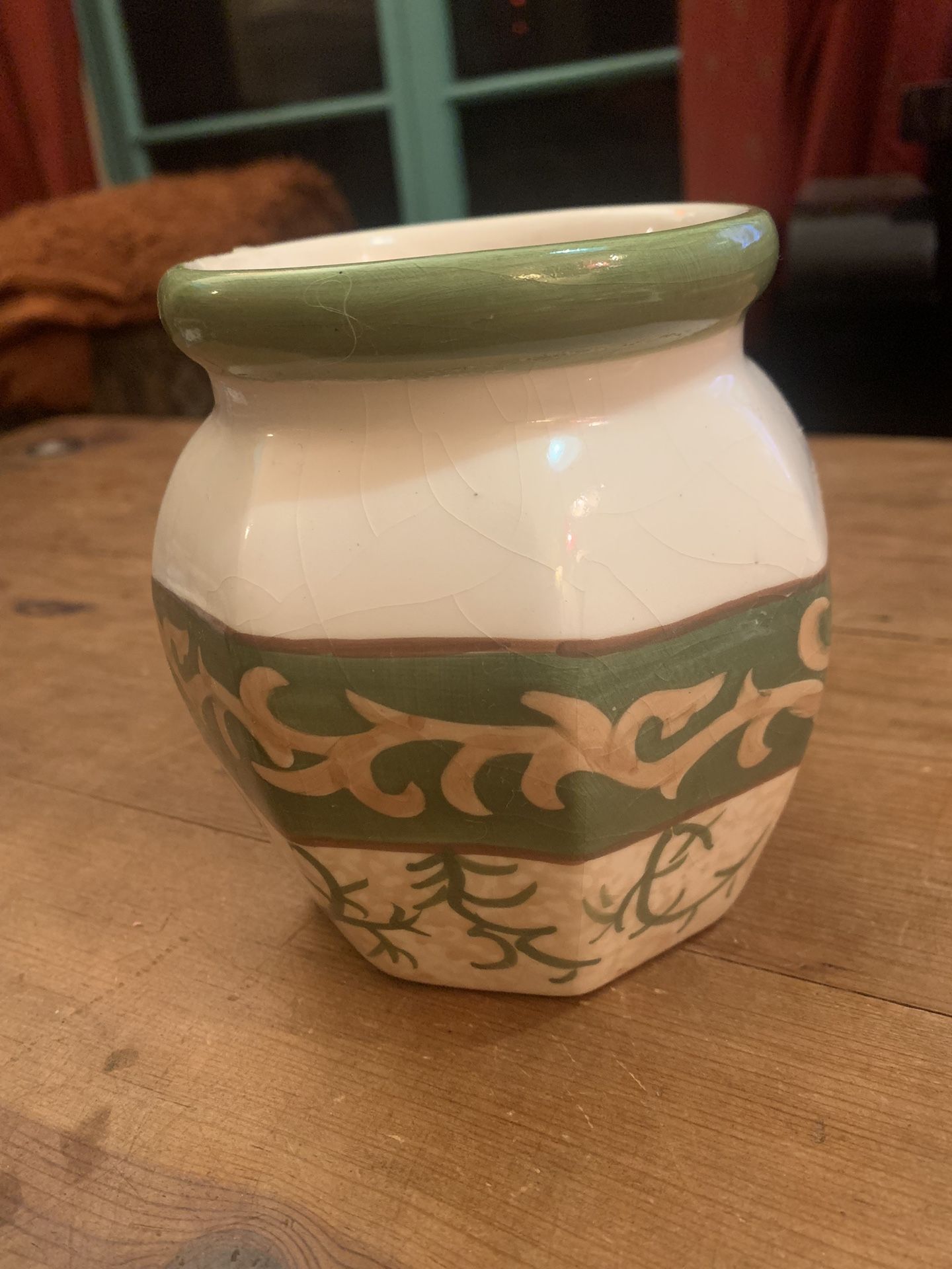California Pantry’s Classic Ceramic Flower Pot / Planter / Vase. Lovely colors & design , ideal to hold a small potted plant or small floral arrangement. This decorative ceramic collectible is in excellent condition.