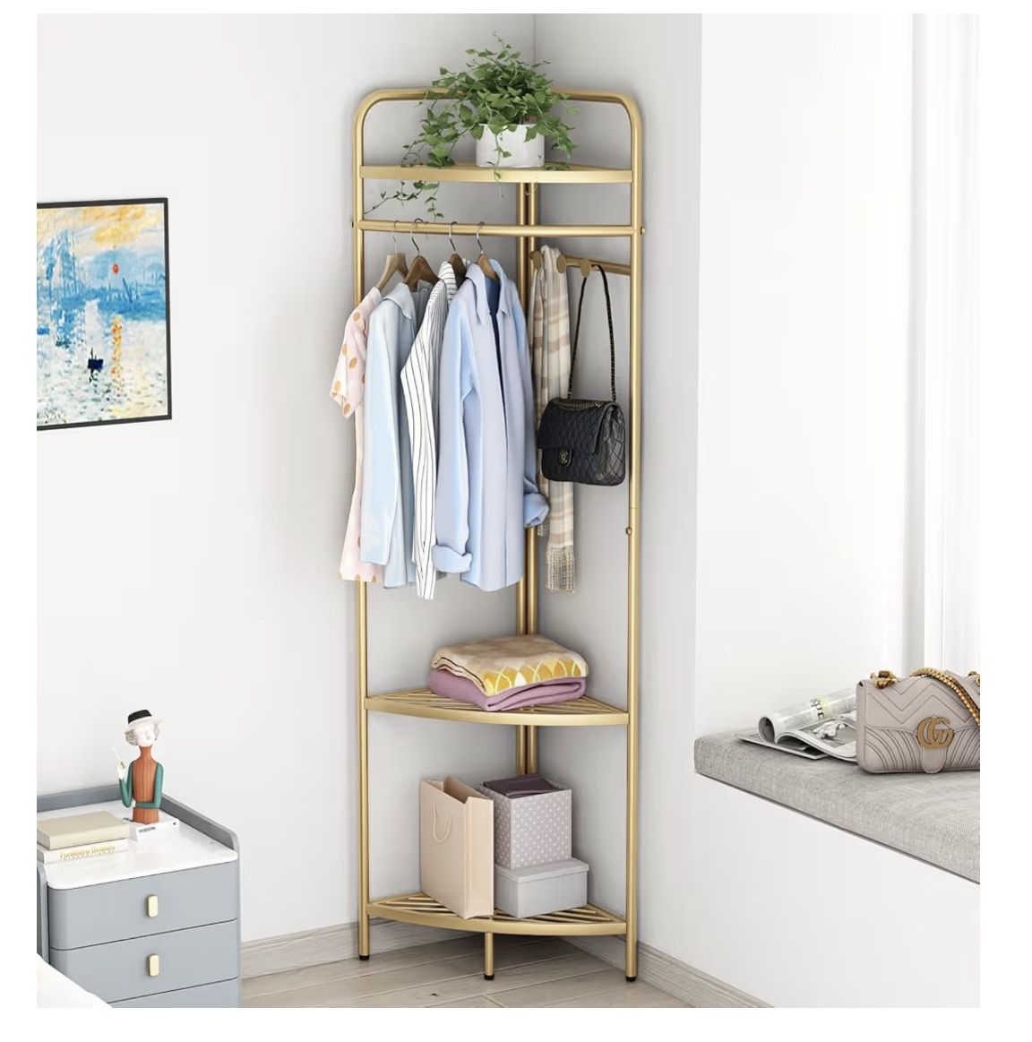 Brand: DOORXIFO Corner Gold Clothing Racks Freestanding, Gold Metal Coat Racks with Hooks, Heavy Duty Modern Clothes Rack with 3 Tier Storage Shelves for Home,Bedroom,Living Room
