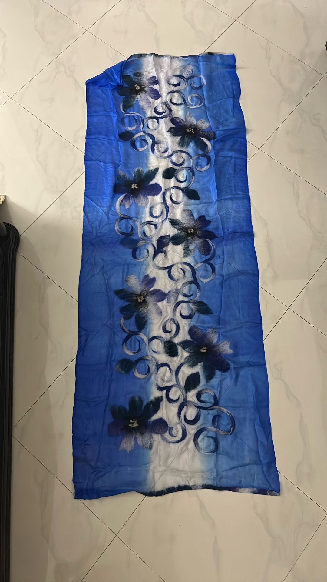 This is a royal blue nuno felted silk scarf with floral merino wool accents. This scarf is hand-painted , it is an original work of art, a one-of-a-kind piece. Size 25”x67” 100% silk Handmade craft