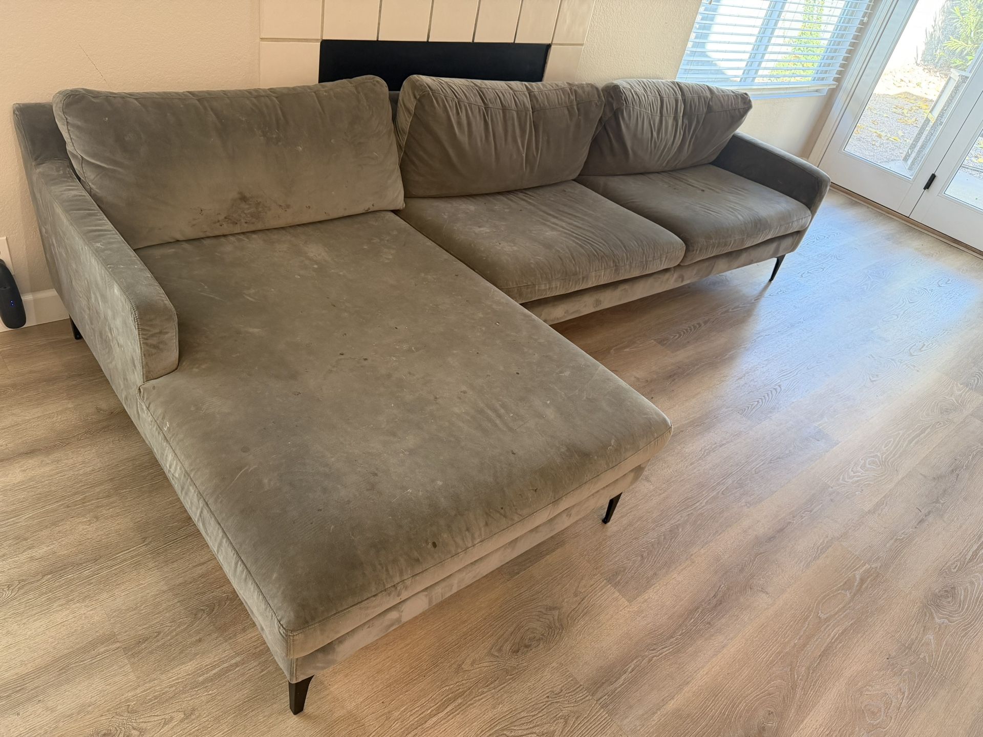 $25 Gray sectional. CURB PICK UP ONLY. Used. Just needs a good cleaning. Length of entire sofa is 117 inches. It is 2 pieces together. Chase lounge is 63 in x 40 in. Micro suede material.