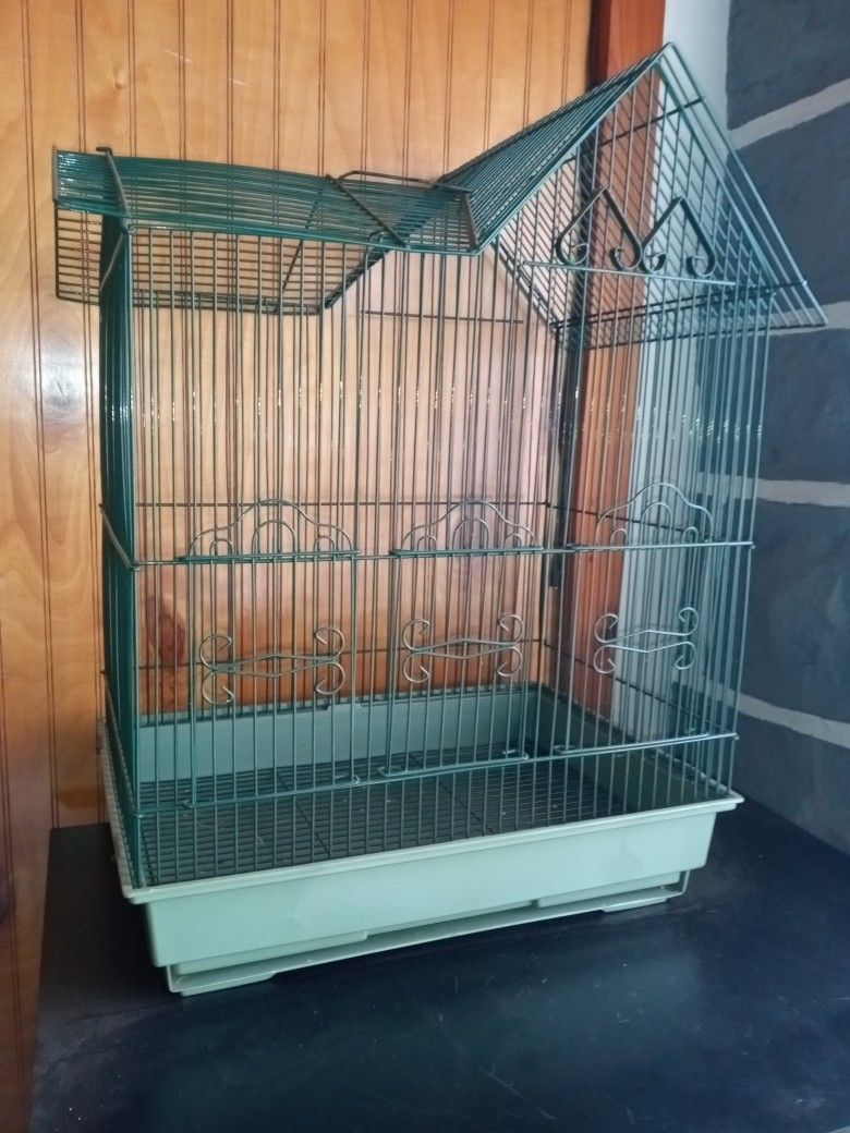 Empty Green Birdcage With 3 Doors, Metal Bars And Spill Pan