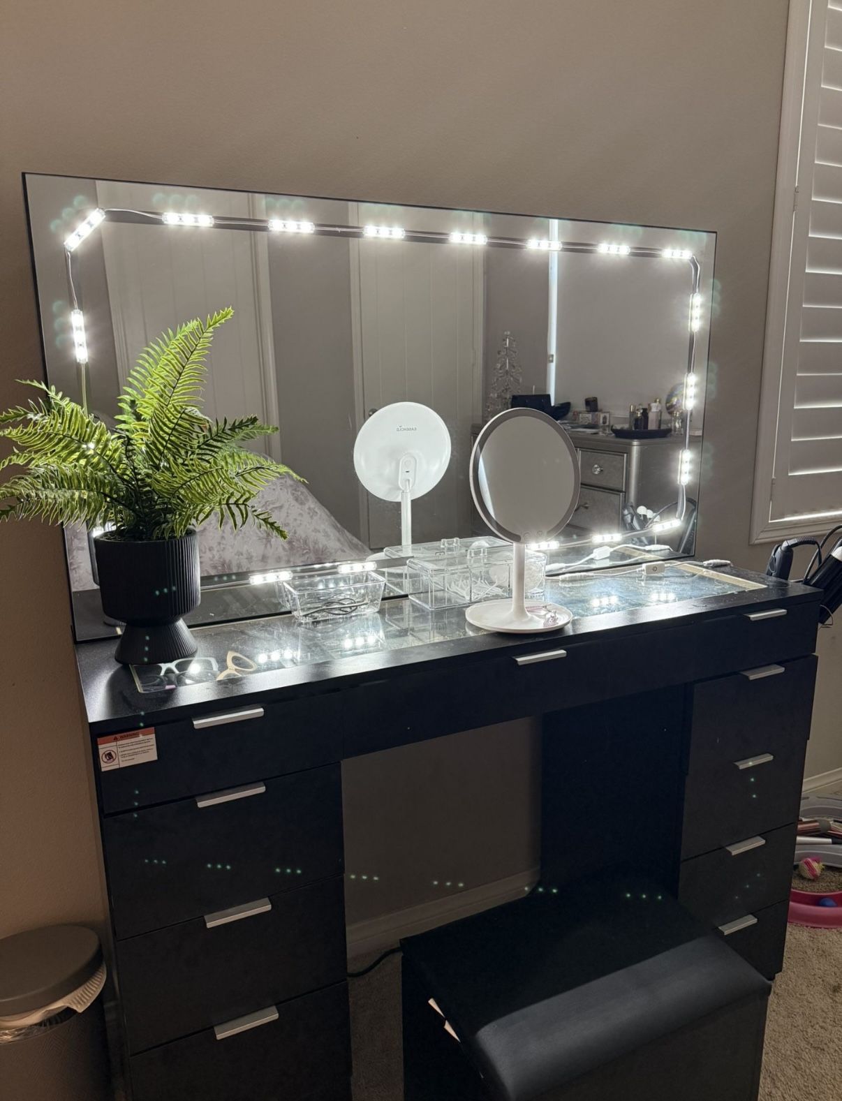 Selling a large makeup vanity with a full glass makeup surface and tons of storage. This vanity has 11 drawers and plenty of space for makeup, skincare, hair tools, and accessories. It’s sturdy, works great, and looks beautiful set up. The original LED mirror no longer works, which is why I added bright stick on vanity lights around the mirror. The lights work perfectly and honestly give better lighting for makeup. Everything functions as it should. The very bottom left door sits slightly crooked and sags a bit due to how it was originally assembled, but it’s purely cosmetic and should be an easy fix for someone who’s handy with screws. It doesn’t affect how the vanity works at all. Overall, this is a great vanity with lots of storage and a clean glass top, perfect for a glam room, beauty setup, or bedroom. Originally bought it for $985. Priced accordingly due to the minor cosmetic issue. Pickup only.
