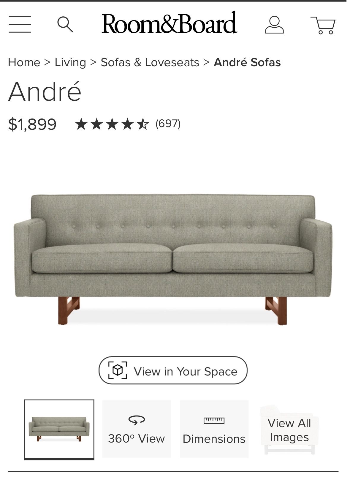 Room & Board André Sofa Gently used but in good condition. Color: Holtz Putty (grey) Legs: walnut Dimensions 76”w x 35”d x 31” h Comes from a smoke free, pet free home Retails for $1,899