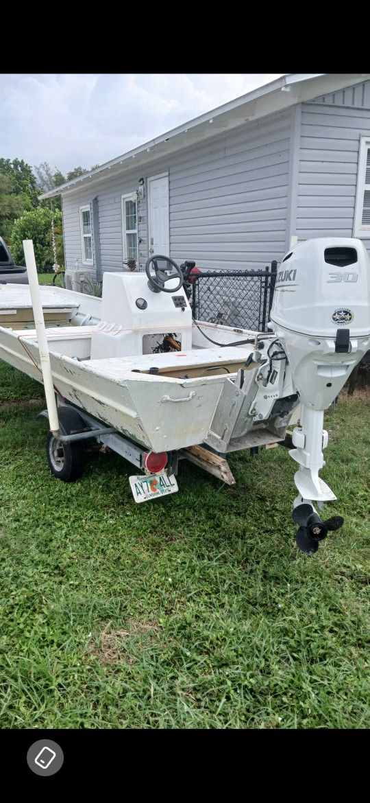 What is in great shape with absolutely no leaks . It's gauge aluminum with a nylon composite deck. So there's no stress on your boat from deck weight. Boat has a 6 gallon. Fish area with brand new pump. & Brand new bilge pump. The trailer has brand new lights, new axel spendal and bearings, new leaf Springs. And new running lights. The boat has a console with new steering and all new cabling and running gear to its motor.. The Motor is virtually new . Just finished its break in period and been serviced. It's a 30 horse four stroke Suzuki. With All the bells and whistles power tilt and shrimp,Both electric and pull start. I have nearly eleven thousand invested.