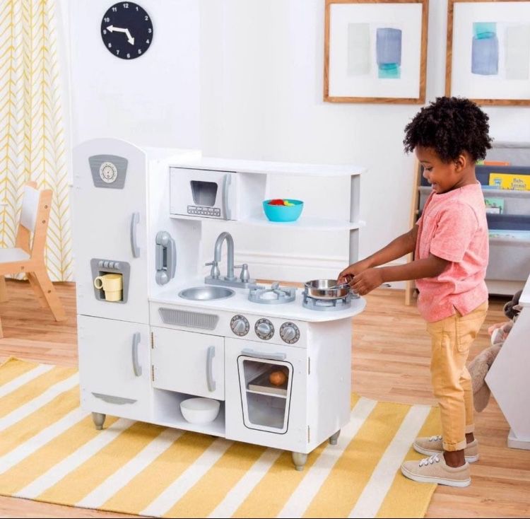 Vintage Wooden White Play Kitchen with Ice Maker & Play Phone, Kids Toys, New In Box New in the box. Oven, cabinet, freezer, refrigerator and microwave doors open and close Working knobs on oven and sink Cordless phone with hands-free clip Convenient storage above and below the sink Large enough that multiple children can play at once See-through doors on oven and microwave Removable sink for easy cleanup