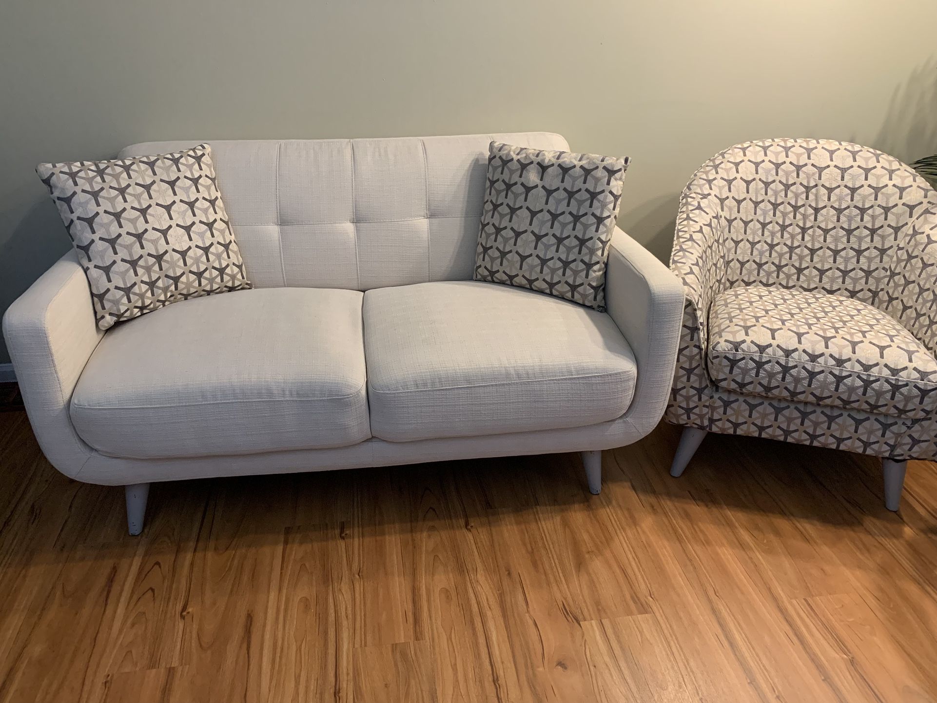 Serious inquiries only. Smoke and pet free home. Measurements: Sofa: Length 85 cm, height 34 cm, width 32 cm. Loveseat: Length 60 cm, height 33 cm, width 32 cm. Sofa, loveseat, chair, and 4 pillows