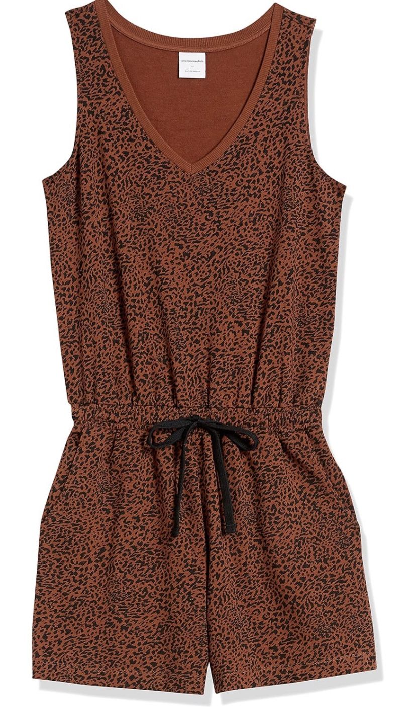 NEW Amazon Essentials Women's Studio Terry Fleece Romper Size Medium Color: Dark Camel/Black, Ikat Product details About this item Fabric Type 57% Viscose, 38% Cotton, 5% Elastane Care Instructions Machine Wash Origin Imported Closure Type Drawstring About this item REGULAR FIT: Close but comfortable fit through chest, waist, hip and thigh STUDIO LIGHT TERRY FLEECE: A lightweight and breathable fabric with an ultra-soft finish. This terry fleece has a moisture-wicking finish, helping you stay comfortable, and a 4-way gentle stretch for more flexibility during workouts. STUDIO ROMPER: Relax and lounge in this effortless all-in-one romper. Designed to sit mid-thigh. Whether you're heading out for a jog or running errands with the kids, our apparel is made to work out, live in, and lounge. DETAILS: Featuring a sleeveless design, scooped v-neckline, functional side pockets, and an adjustable drawcord waist. INSEAM: 3 1/2" on US size S. Description Product Description Amazon Essentials is focused on creating affordable, high-quality, and long-lasting everyday clothing you can rely on. Our line of women's apparel includes cashmere sweaters, fleece and down jackets, and more, including plus-size options. Our consistent sizing takes the guesswork out of shopping, and each piece is put to the test to maintain the highest standards in quality and comfort. . Amazon Essentials is focused on creating affordable, high-quality, and long-lasting everyday clothing you can rely on. Our line of women's apparel includes cashmere sweaters, fleece and down jackets, and more, including plus-size options. Our consistent sizing takes the guesswork out of shopping, and each piece is put to the test to maintain the highest standards in quality and comfort.