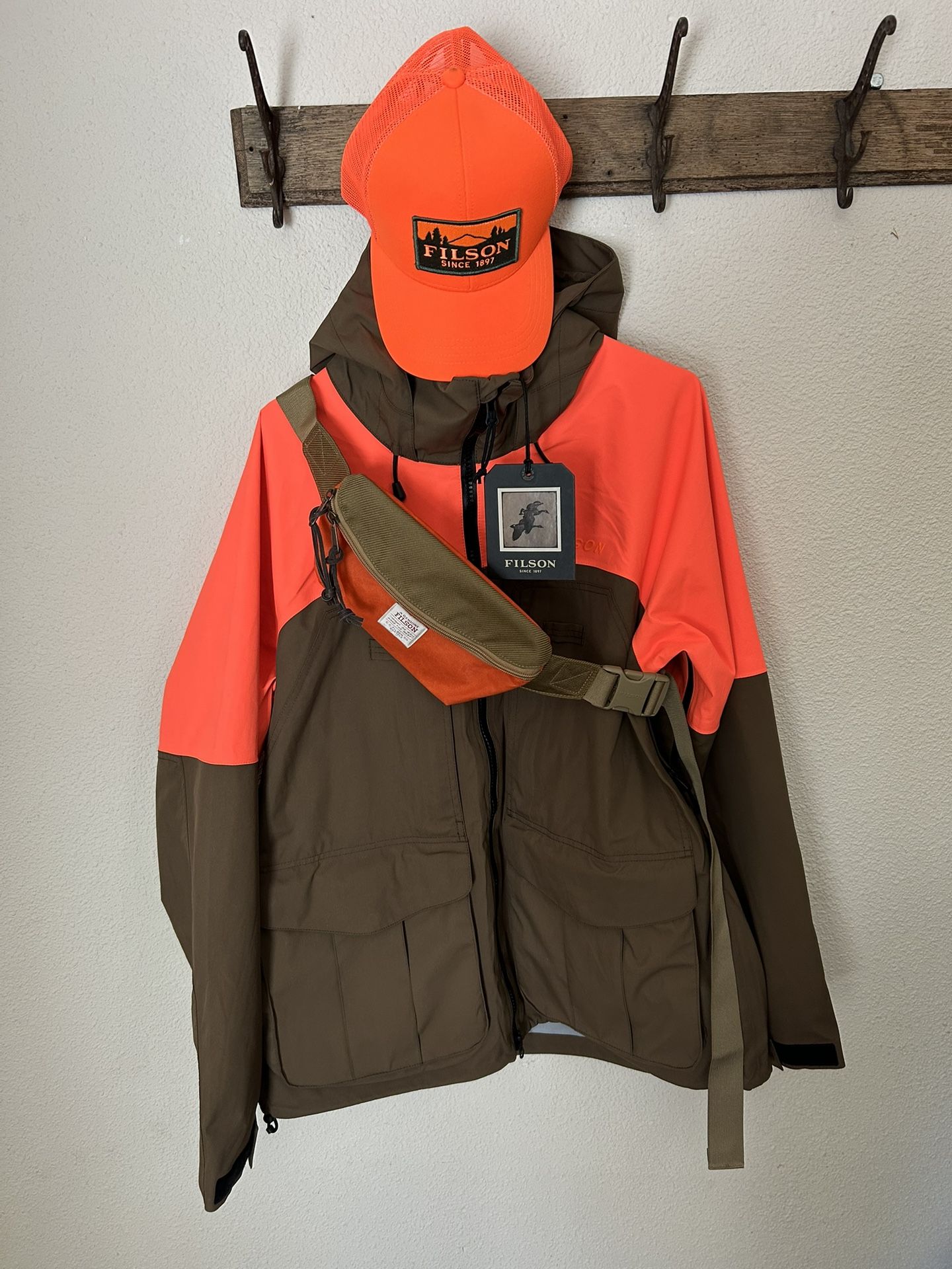 New Hi-vis hunting 3 layer field jacket with chest bag and hat. Size large for the jacket. No trades please