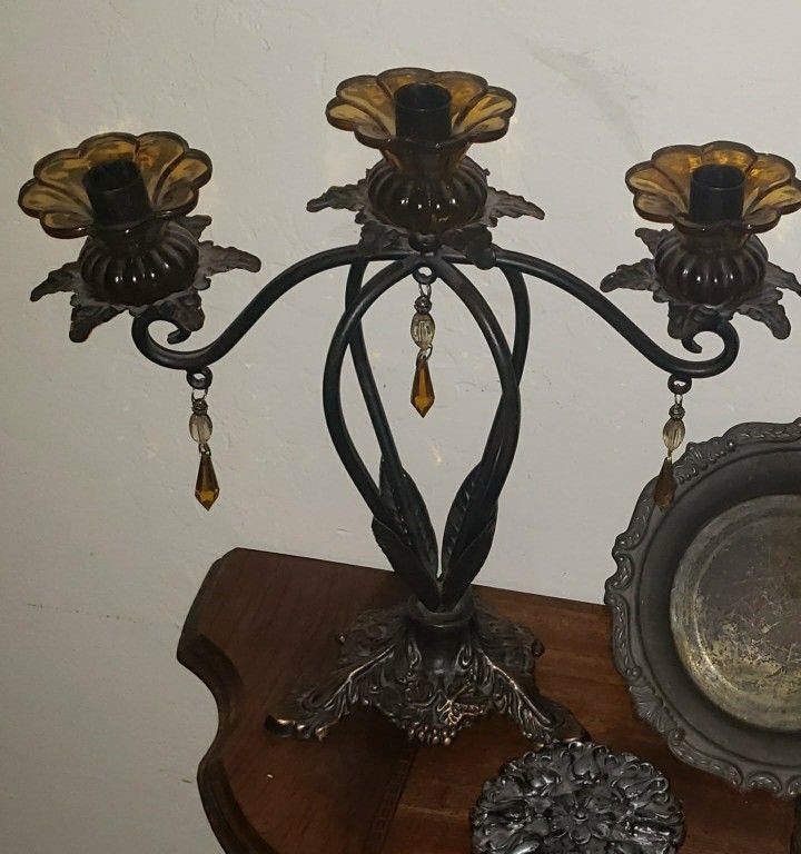 VINTAGE IRON METAL AMBER BEADED CANDELABRA CANDLE HOLDER CENTERPIECE DISPLAY TABLE DECOR