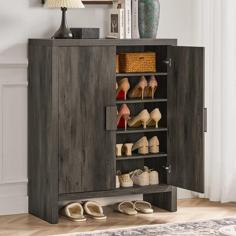 Spacious Storage: This 41" tall shoe cabinet offers 5-tier storage, accommodating up to 24 pairs of shoes, with three adjustable shelves for various footwear like heels, boots, and sneakers. Elegant Design: Featuring a toasted black finish and classic woodgrain panels, this vintage-inspired cabinet seamlessly blends into entryways, living rooms, or bedrooms. Robust Construction: Crafted with 1.5" thick woodgrain panels and steel hinges, ensuring a sturdy and durable structure with a substantial vintage aesthetic. Thoughtful Features: Includes an anti-tip kit for safety, floor protective pads, a breathable mesh back for airflow, and durable stainless steel hinges for smooth operation. Versatile Organization: The top surface provides space for keys and bags, while an open base offers convenient storage for daily-use shoes. Effortless Assembly: Setup is streamlined with clearly numbered parts, a detailed manual, and a step-by-step video guide, recommending two people for easier assembly. SOC-136-BK-80