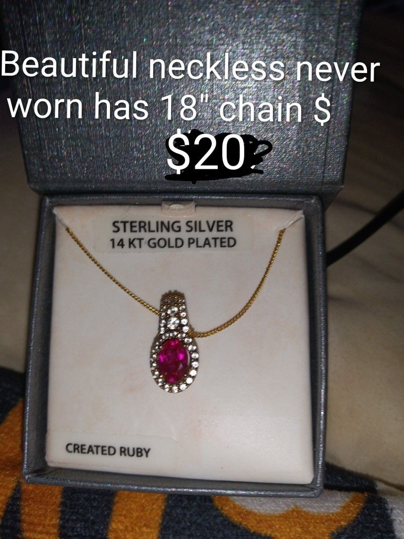 NEED GONE ASAP PRICE REDUCED Selling for my mom 14 KT gold plated, featuring a created ruby it has a 18" chain. There's nothing wrong with it she just doesn't wear it, it's actually never been worn asking $20 FIRMMMM NO HOLDS SERIOUS PPL ONLY MUST PICKUP AT 100 WESTBURY MEWS DR SUMMERVILLE