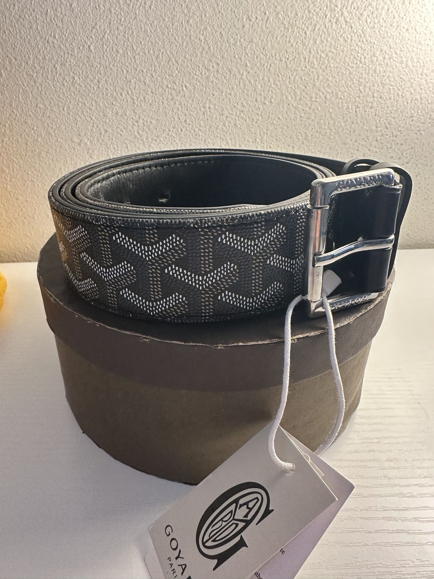 The Goyard Belt in size 95 is a high-quality leather belt designed for men. Made in France, this black belt features the iconic Goyard pattern and is suitable for both work and dress purposes. With a regular size type and no personalization. This belt has 5 holes. Some minor creases from wear, Some curving but in good condition. Occasionally add leather conditioner for shine.