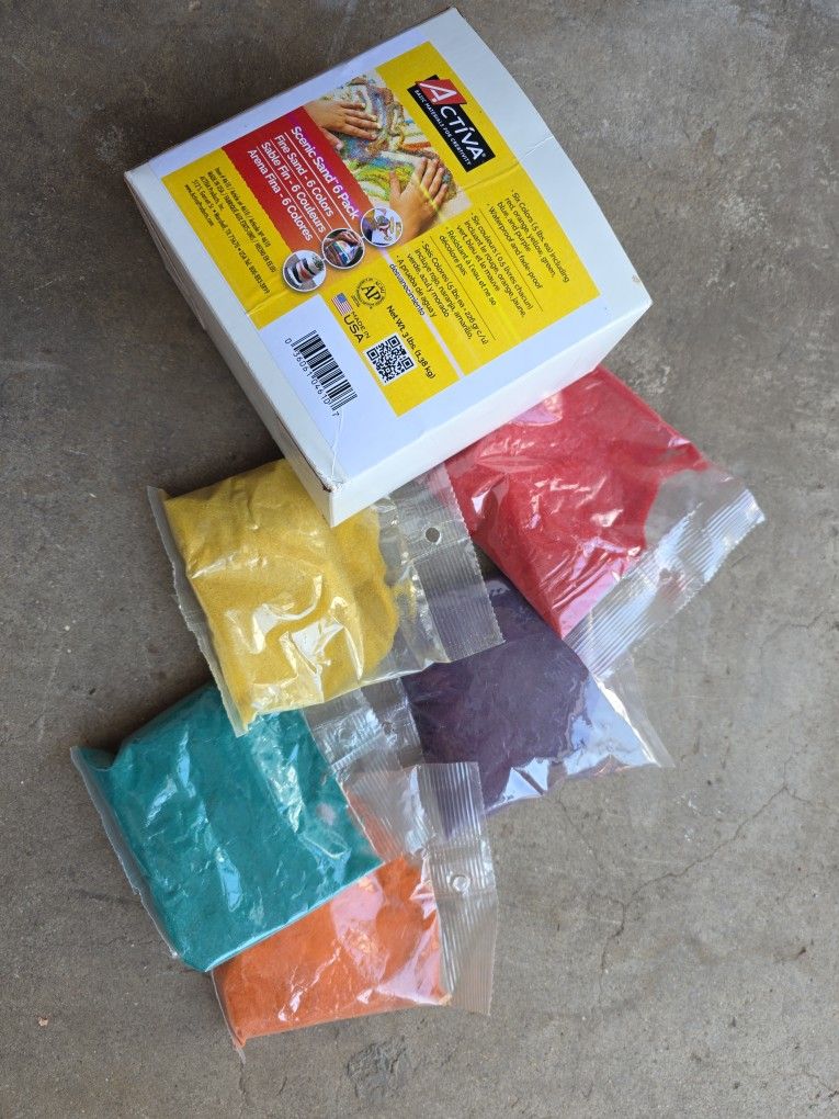 5 new bags of sand. Either to use with decor or crafting. Orange, red, yellow, green, purple