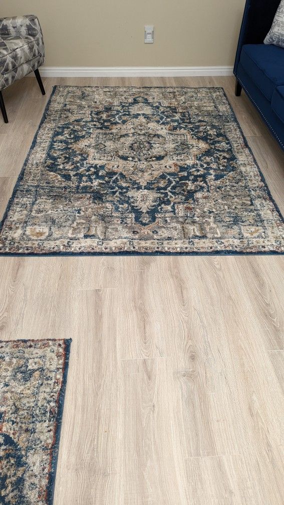 5x7 in size. and 3x5. Bought this pair of rugs from bed, bath and beyond. Small for my living room now..selling both for $100.. originally bought for $300.