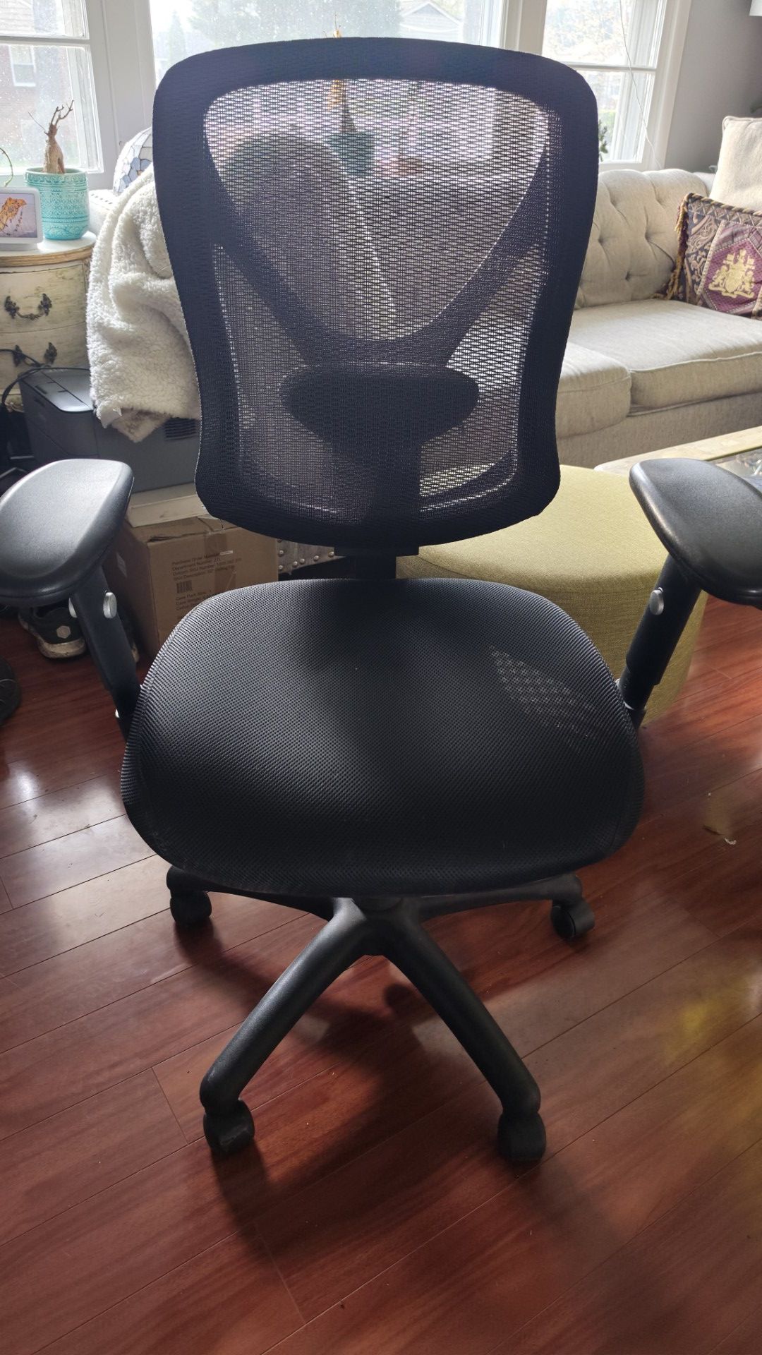 Comfy black office chair. Mesh back and seat for good airflow. Has adjustable height and tilt. Swivels and rolls easily on wheels. Great for home office or desk.I in very clean condition. Smoke and pet free home.