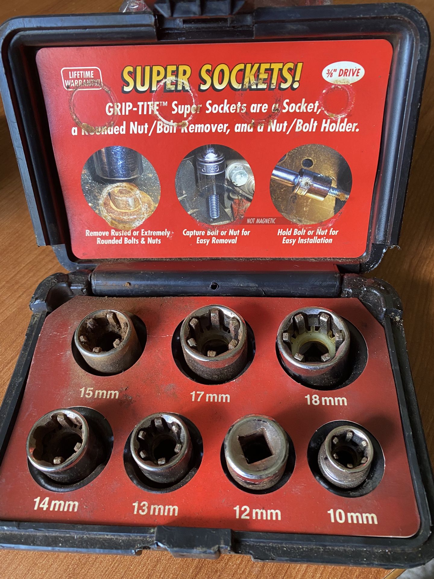 Grip-Tite Super Socket set, specifically a 7-piece metric set (00103) with 3/8" drive, designed for specialized bolt extraction and holding. Unique Design: Features hardened steel teeth inside the socket that bite into the flats of nuts or bolts, allowing them to grip rusted, damaged, or severely rounded fasteners. Dual Function: Acts as both a remover for stripped fasteners and a holder for installing bolts in hard-to-reach places without using magnets. Durability: Made of chrome vanadium steel for high strength and toughness. Warranty: Comes with a lifetime warranty. Sizes included: 10mm, 12mm, 13mm, 14mm, 15mm, 17mm, and 18mm