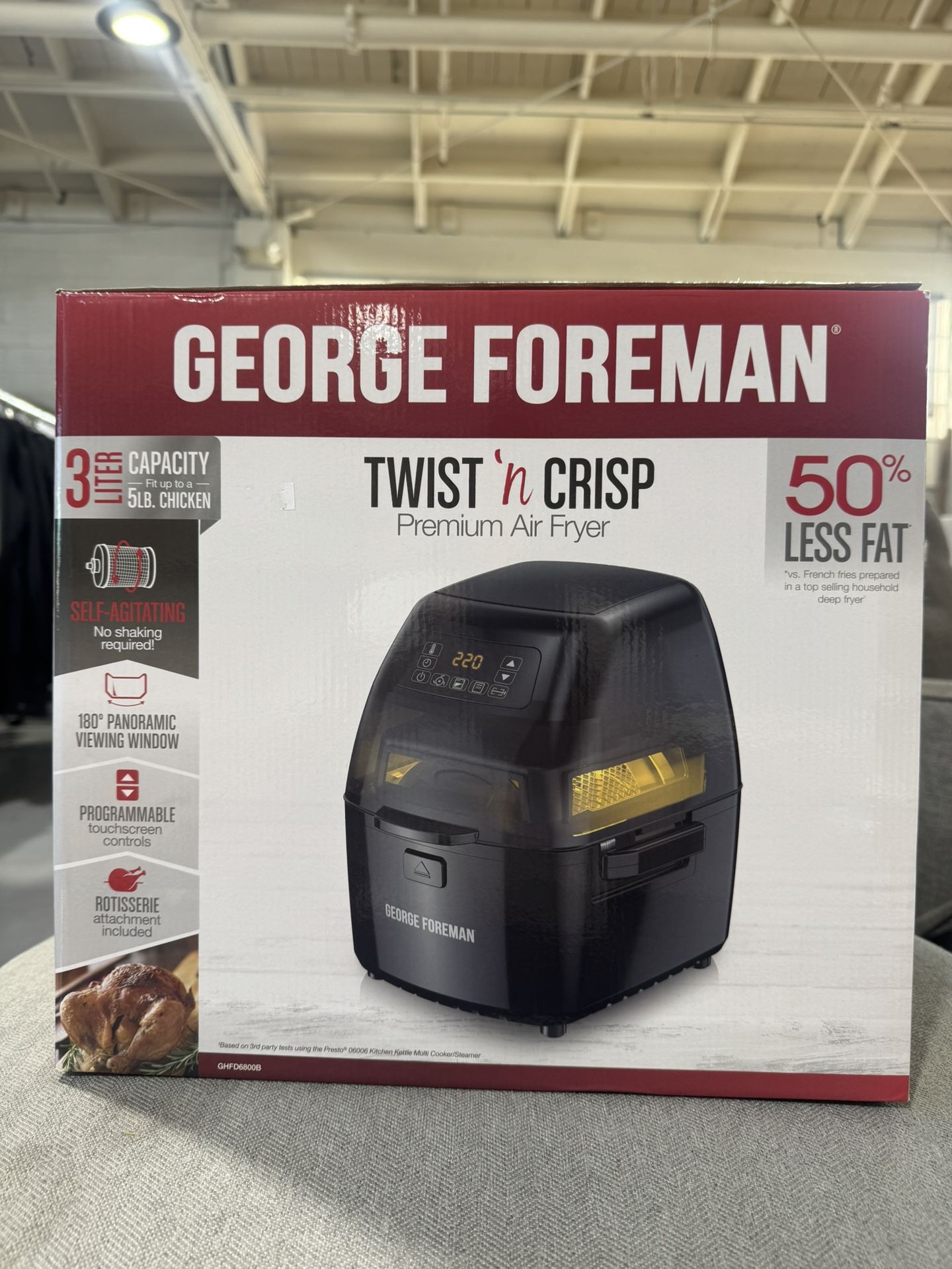Revolutionize your cooking with the George Foreman Twist ’n Crisp Premium Air Fryer. This innovative air fryer offers a healthier way to enjoy your favorite fried foods with up to 50% less fat compared to traditional deep frying. Its unique design and advanced features make it a versatile addition to any kitchen, perfect for preparing a wide variety of meals, from crispy fries to a whole roasted chicken. Key Features • 3L Capacity: Generous capacity fits up to a 5lb whole chicken, ideal for family meals or entertaining. • Twist ’n Crisp Technology: Features an exclusive rotating basket that continuously tumbles food during cooking, ensuring even crisping and eliminating the need for manual shaking. • 50% Less Fat: Enjoy delicious, crispy results with significantly less oil, promoting healthier eating habits. • 180° Panoramic Viewing Window: Monitor your food’s progress without opening the air fryer, preserving heat and ensuring perfect results. • Programmable Touchscreen Controls: Easy-to-use digital controls for precise temperature and time adjustments. Max temperature of 425°F. • Rotisserie Attachment Included: Perfect for roasting whole chickens or other meats, providing tender and juicy results with a crispy exterior. • Self-Agitating Design: No shaking required! The rotating basket does all the work for you. • Dishwasher-Safe Parts: Removable parts are dishwasher safe for quick and easy cleanup. • 60-Minute Digital Cook Timer with Auto Shutoff: Set it and forget it! The timer ensures your food is cooked to perfection and automatically shuts off for safety. Condition Brand new in box. (If applicable, adjust based on actual product condition) What’s Included • George Foreman Twist ’n Crisp Premium Air Fryer • Rotating Basket • Rotisserie Attachment