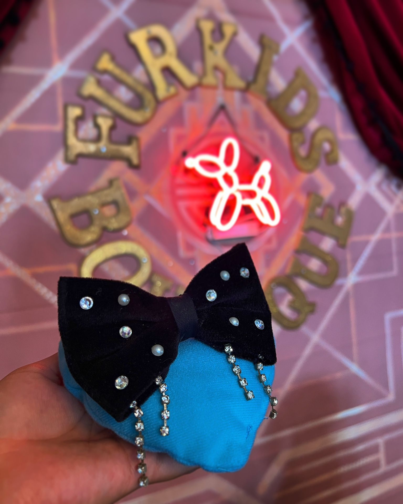 Dog bow tie Black velvet Clear rhinestones White pearls Diamond chain links Elastic straps for the collar