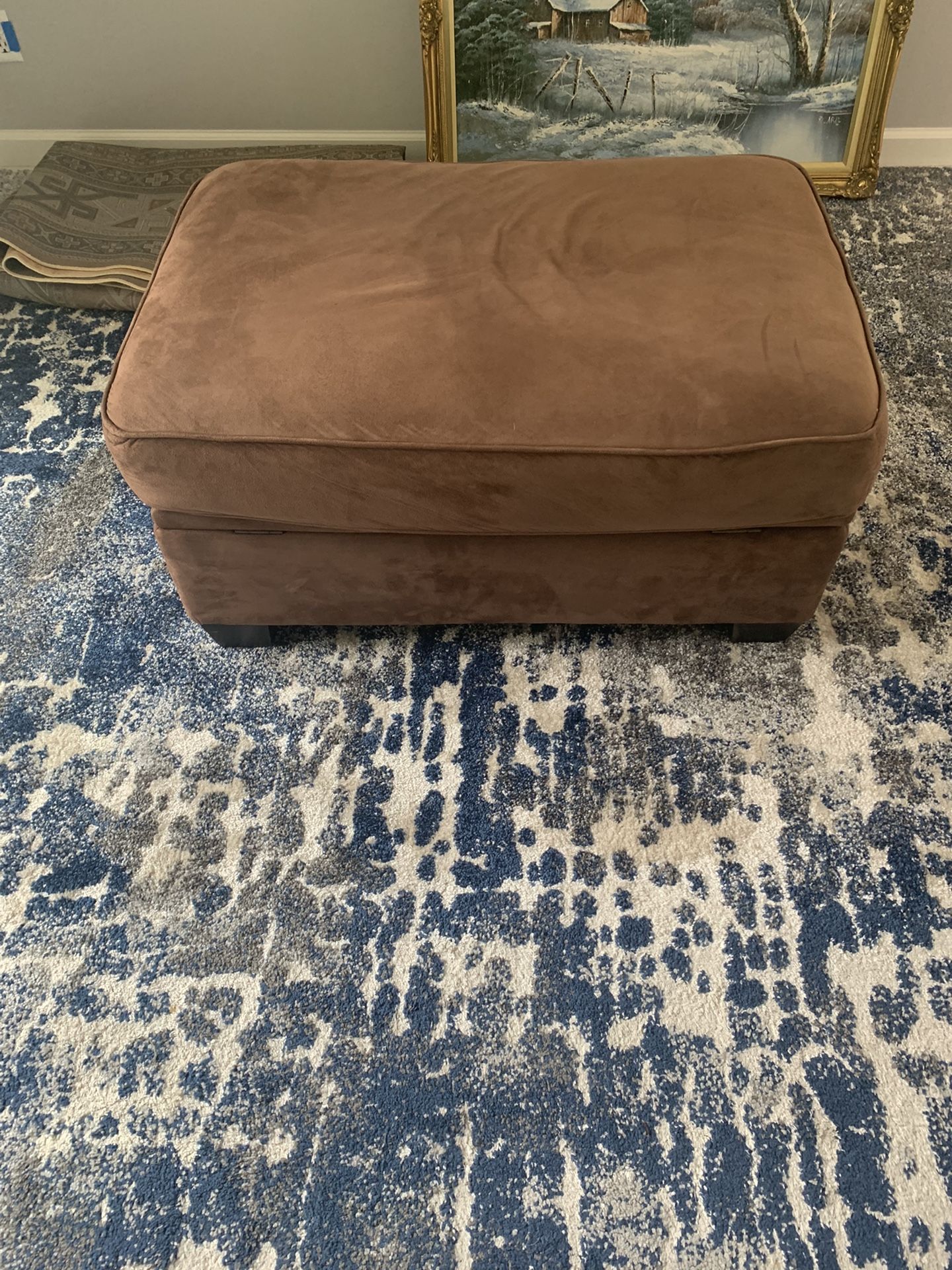 Cider wood , brown , cedar wood Great condition , very clean Use it as coffee table or ??? Decoration Not including what is inside storage ottoman 37x27 inches proximity Depth 10 inch White and blue rug : $150 sell separately