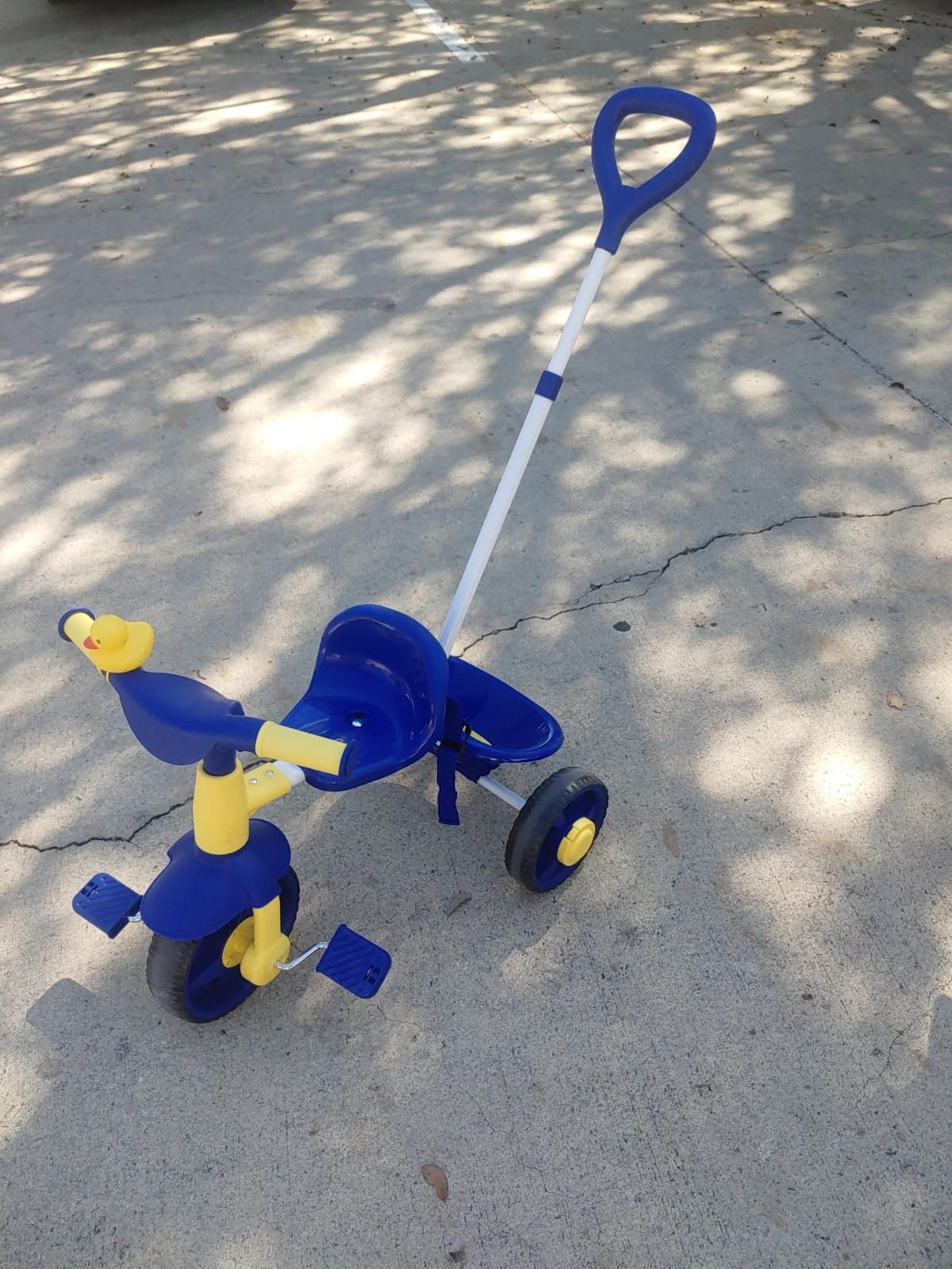 Moving sale! Lightly used *KRIDDO 2-in-1 tricycle* for toddlers, age 18 months to 3 years. Sturdy and fun, with EVA wheels, a *removable parent push handle*, and a cute duck bell! • Ideal for toddlers learning to ride • Safety harness, non-slip pedals, rear basket • Great condition – used only a few times • Blue/yellow color combo – super fun for kids Retail price is around 60 new — selling fast for less! Pick-up only First come, first served!