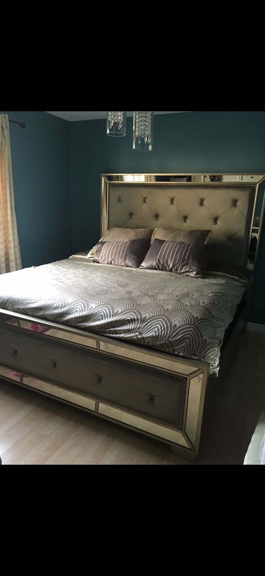 Beautiful king-size bed frame and mattress for sale in excellent condition. Modern glam style with tufted upholstered headboard, mirrored accents, and sturdy construction. ✔️ Clean, well-maintained ✔️ Smoke-free home ✔️ Very comfortable mattress if you want it Selling because I’m redecorating 📏 Size: King 🚫 Pickup only (will need help loading) 📍 Location: Pomona Serious inquiries only. Message me if interested!