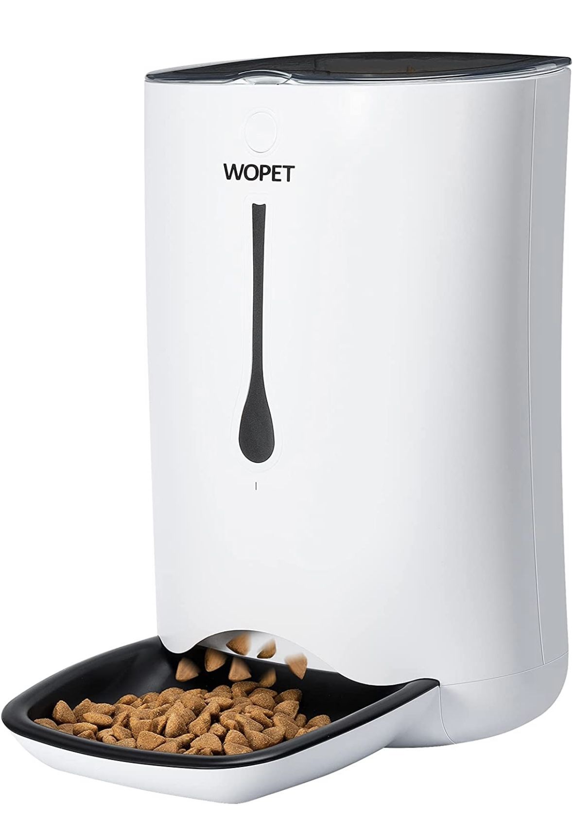 Non-spill, Flow control, Programmable, FEED YOUR PET WHILE YOU’RE AWAY - Schedule up to 4 automated feedings per day using the built-in programmable timer. Program each meal time with a few button clicks on an easy to use LCD screen. Control food portions from 2 teaspoons to 4.5 cups per feeding. NEVER MISS A FEEDING. The WOpet feeder is wall powered and/or battery powered. In case of a power outage, the feeder will continue to function on 3 D-size batteries to assure your pet gets fed (batteries not included). CONTROL PORTION SIZE OF EACH FEEDING - Dispense anywhere from 2 teaspoons to 4.5 cups dry food per feeding to sustain any size animal. You can program a unique portion size for each automatic feeding, allowing you to ESTABLISH REGULAR EATING ROUTINES throughout the day without any stress. RECORD A CUSTOM MESSAGE FOR YOUR PET - Keep your pet excited about meal times! Press and hold the mic button for three seconds to begin recording a message to be played as each feeding dispenses. (e.g. Here, Fido! Come and eat, boy! Good doggy.) OPERATING TIPS - Suitable for dry food only, with the food pellet size ranging from 0.2-0.6 inches in diameter; up to 4 meals a day. The removable hygienic feeding tray is dishwasher safe and easy to clean. LARGE STORAGE COMPARTMENT - The main food storage compartment can hold up to 20 CUPS of food and is removable for easy cleaning and refilling. CUSTOMER SERVICE - Customizable Feeder Great for Dogs, Cats and Small Animals of Various Sizes.Provide a interesting living for your pet with our WOPET pet feeder!24-hour professional service center and 365 day technical support