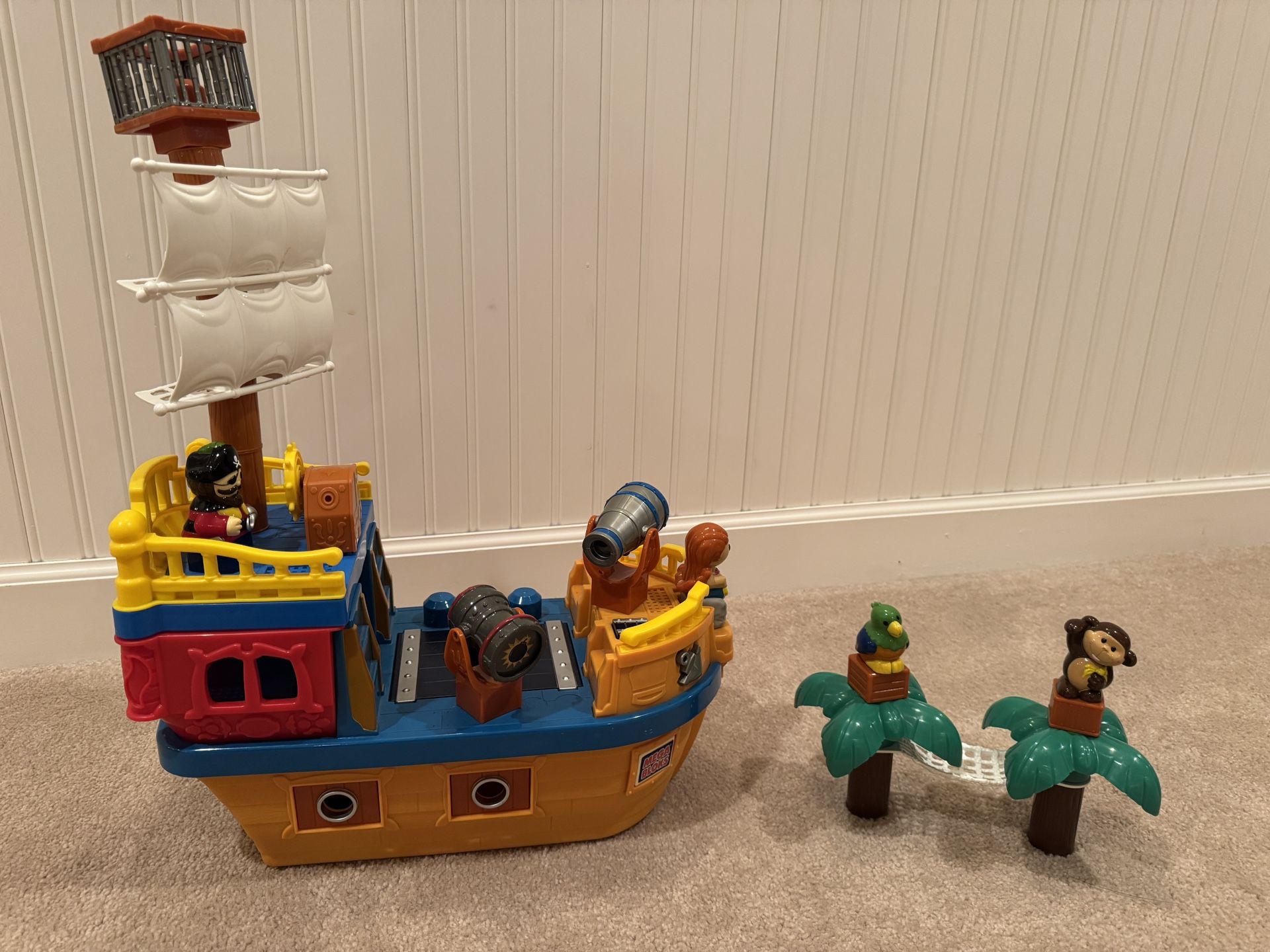 Rare mega blocks pirate ship 24 pieces Set features pirate captain, first mate, bird, monkey, palm trees, captains wheel, cannon, hammock and more! Age 3 and up Provides hours of imaginative play!