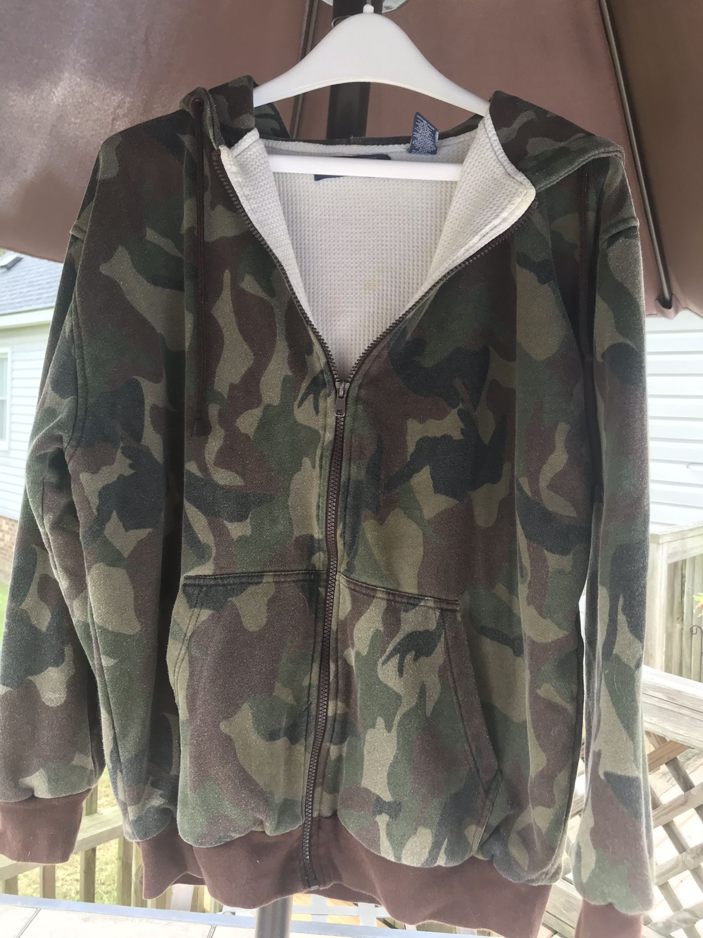 Camo Hooded Jacket. Some stains on inside thermal lining.