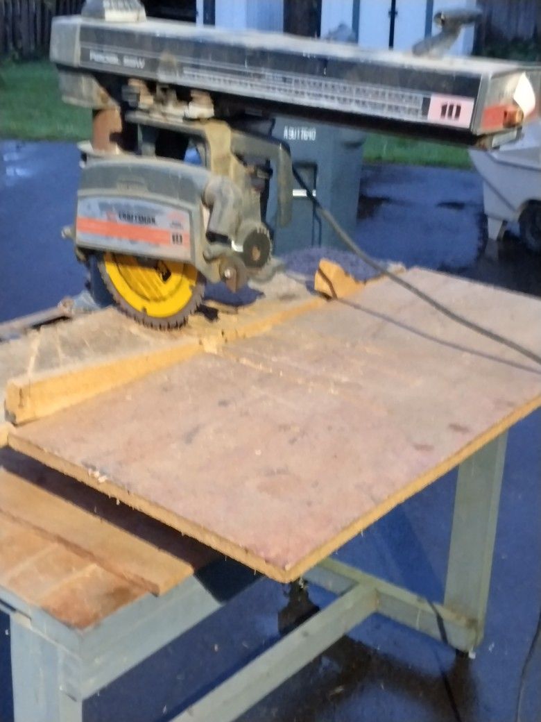 Older saw, all steel, fully functional. Comes with 2 10" saw blades, an adjustable 8" dado blade, and a Radial Arm Saw "How to" book. This saw is securely mounted to a sturdy base on 4 swivel locking casters. Putting the saw at comfortable working heighth.