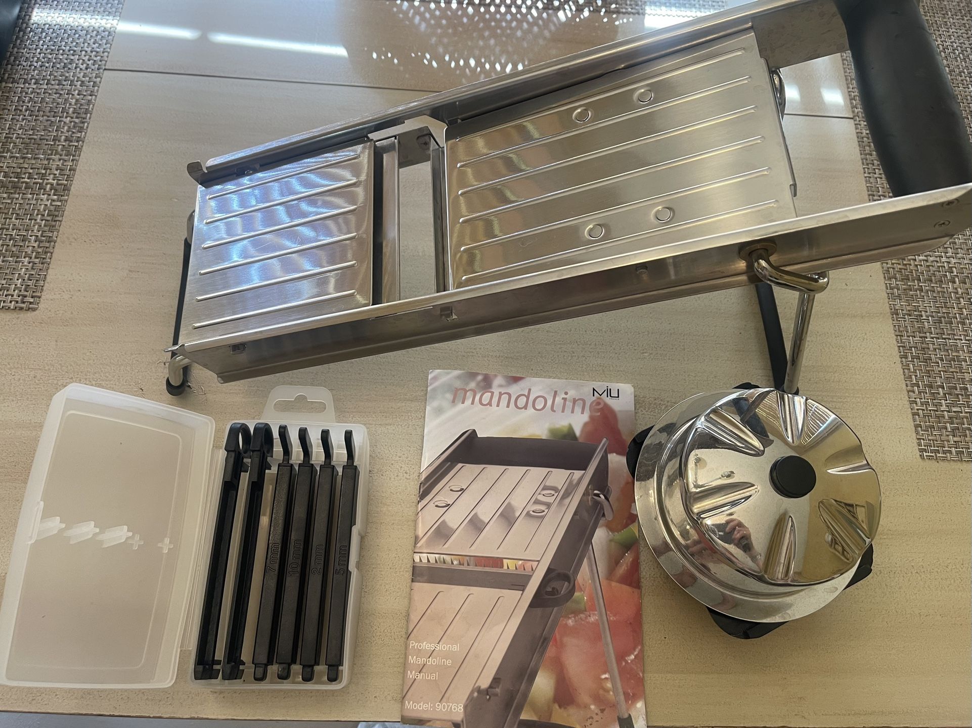 MIU France professional stainless steel mandolin featuring a selection of high carbon stainless steel julienne blades with variable thickness (2, 5, 7 and 10mm) and additional serrated blades for crinkle and waffle cuts, a stainless steel safety holder/pusher and rubberized non-slip grip handle, and user manual. Used one time, so the blades are all still razor sharp. $40 OBO, if the add is still up, it is available.