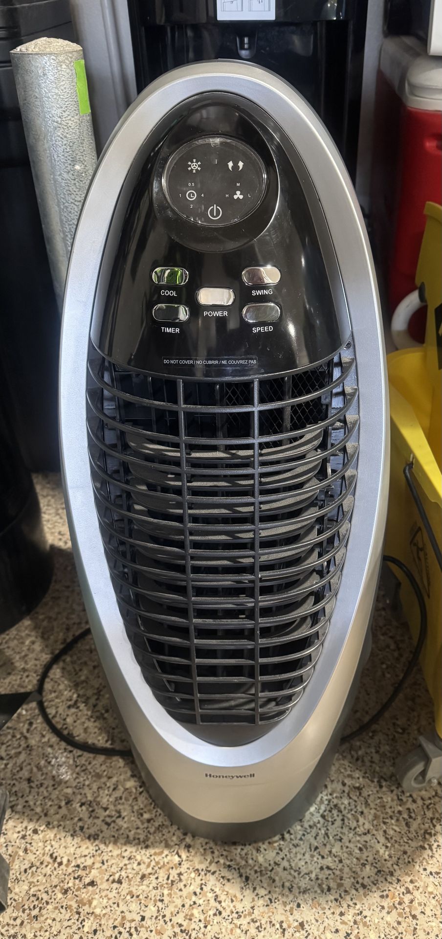 Honeywell Evaporative Air Cooler Remote control, swing function, timer, and multiple speeds. It's a silver and black unit, great for keeping a room cool. Like new condition!