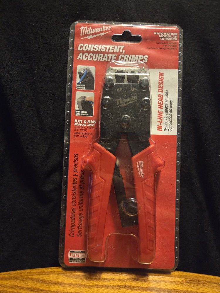 Milwaukee Ratcheting Modular Crimper – RJ11 & RJ45 – Model 48-22-3075 – NEW For sale is a brand new Milwaukee Ratcheting Modular Crimper (Model 48-22-3075), designed for making consistent, accurate crimps on RJ11 (6P) and RJ45 (8P) modular connectors. Perfect for any data, telecom, or low-voltage tech. Features: Ratcheting mechanism ensures even, reliable crimps every time Compatible with RJ11 (6P) and RJ45 (8P) connectors Parallel crimping action for improved precision Easy access side-loading design for quick connector insertion Milwaukee’s durable construction with ergonomic handles Lifetime Warranty (per Milwaukee) Condition: Brand New in sealed retail package Great For: Cat5e/Cat6 cable installs Phone line terminations Networking & low-voltage work DIY and professional use