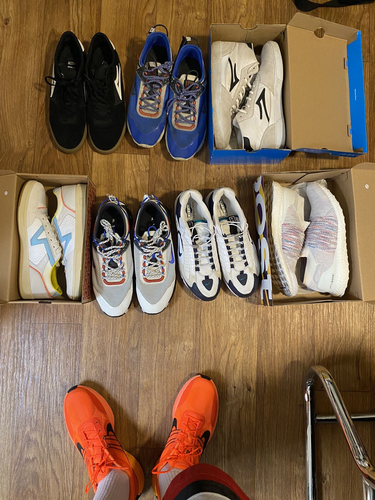 ALL SIZE 13 I have size 13 boots in a seperate post fyi Top row with 3 pairs are well used: $20 a pair Bottom row have much more life in them: New condition vans $40 White red and blue nikes $40 White/Mariners teal air max $40 White/multicolor ultra boost (NO INSOLES) $75 $200 for all 7 pairs If you needs shoes desperately, please hmu. You can have the top row free ππΌ or whatever you feel like spending.