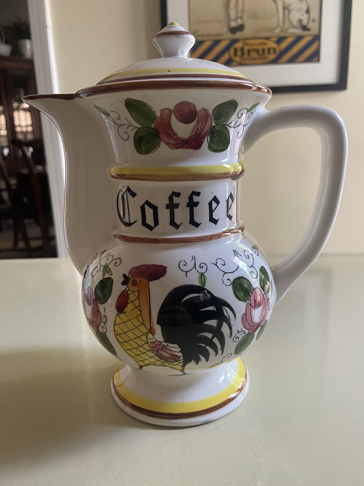 Vintage Royal Sealy Ceramic Coffee Pot, Rooster Folk Art made In Japan and numbered