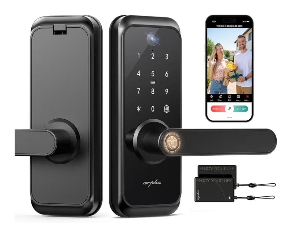 Brand new in box WiFi Video Smart Lock with Camera & Handle - 6-in-1 Keyless Entry (Fingerprint/App/Keypad/FOB/Key), Electric Deadbolt Door Knob for Front, Built-in WiFi, 2-Way Audio, Auto-Lock, Waterproof - Black