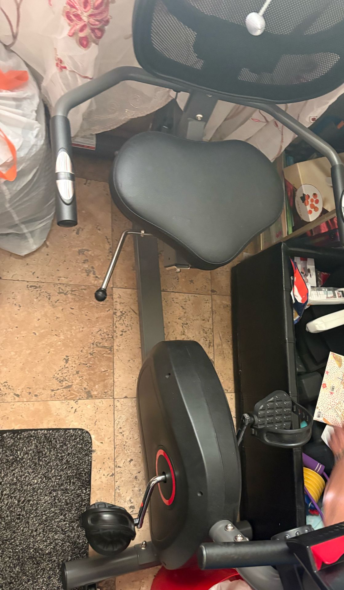 Almost new. Extremely confortable It reclines very well, resting your back. Adjustable. Heart rate, distance, level resistance Includes the mat Orig price. $220