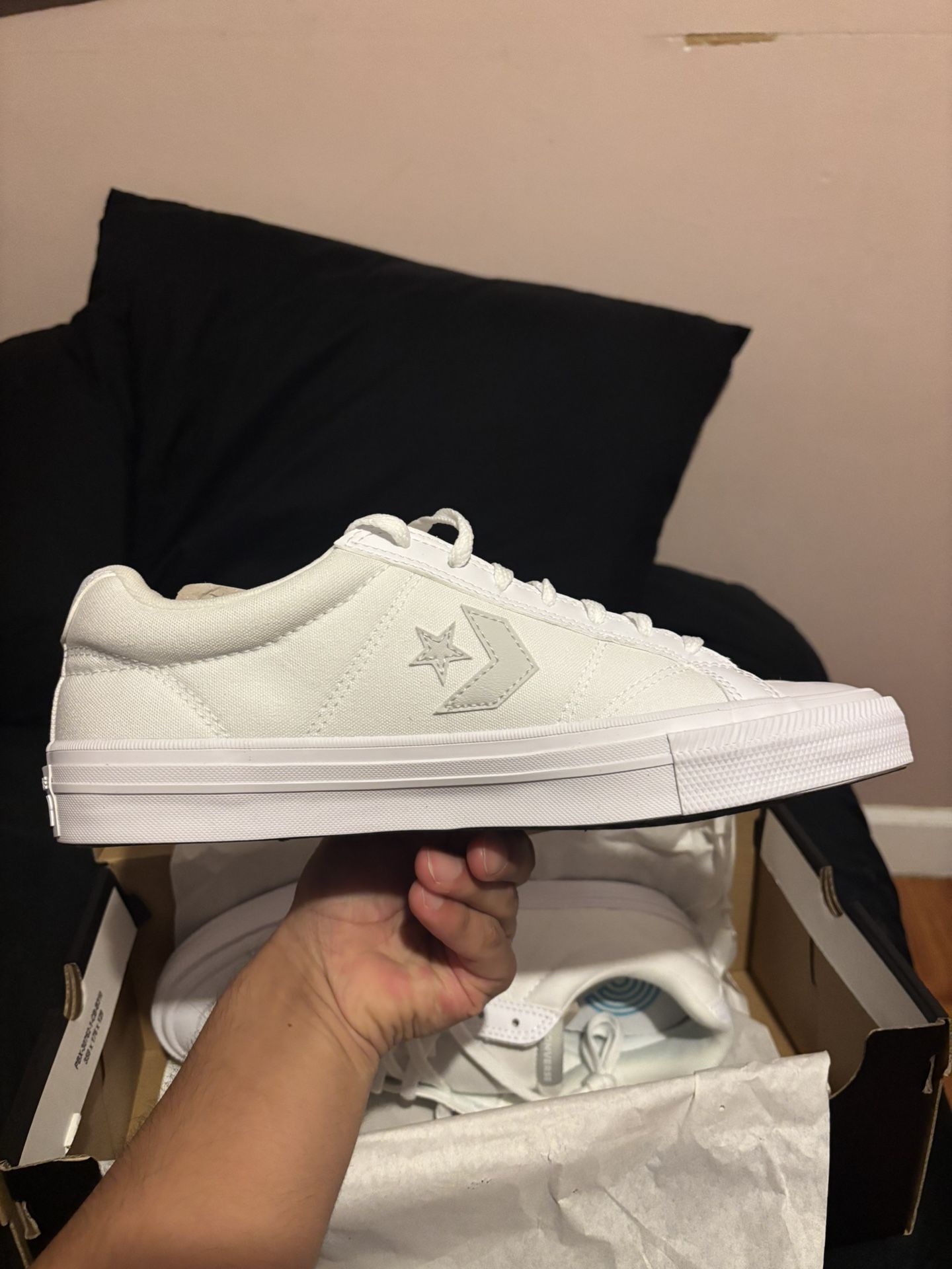 Low top white converse, made out of a canvas material, only tried on one of the shoes not even walked on, shoe size is a 10.5 but fits more like an 11.