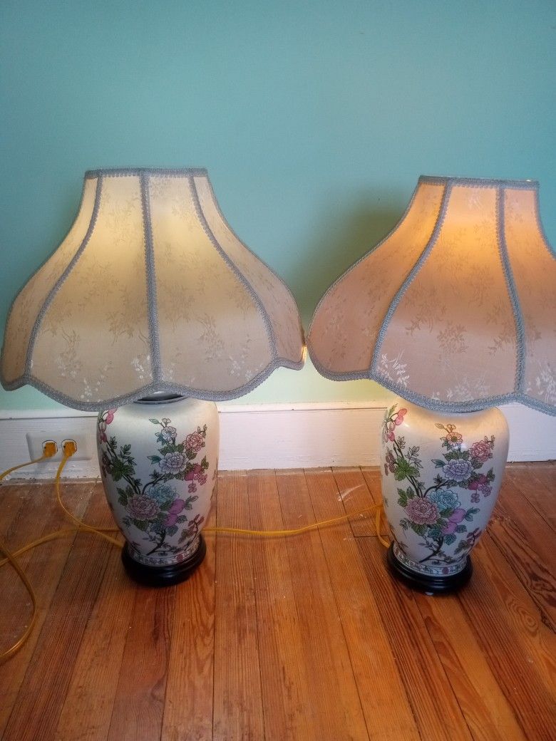 Pair Of Vintage Victorian Style, Floral Table Lamps With Shades