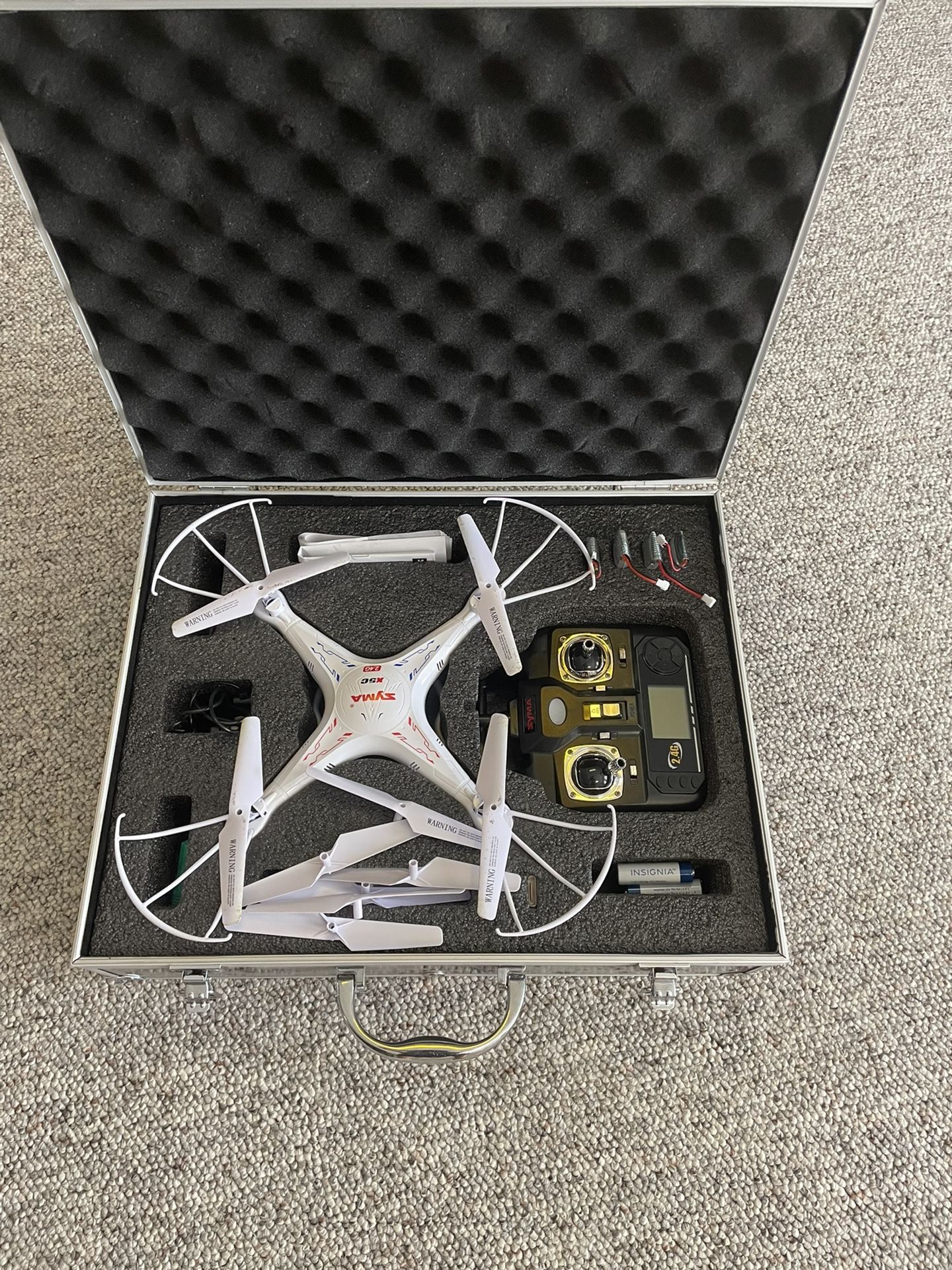 Basic drone with photo/video capability. Comes with extra rechargeable batteries, case and blades (everything in picture). Works fine, just haven’t had the time to use. Any questions please let me know.