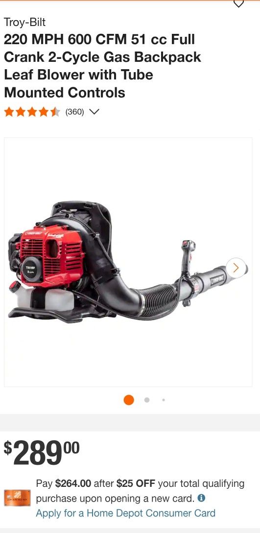 Troy-Bilt 220 MPH 600 CFM 51 cc Full Crank 2-Cycle Gas Backpack Leaf Blower $220