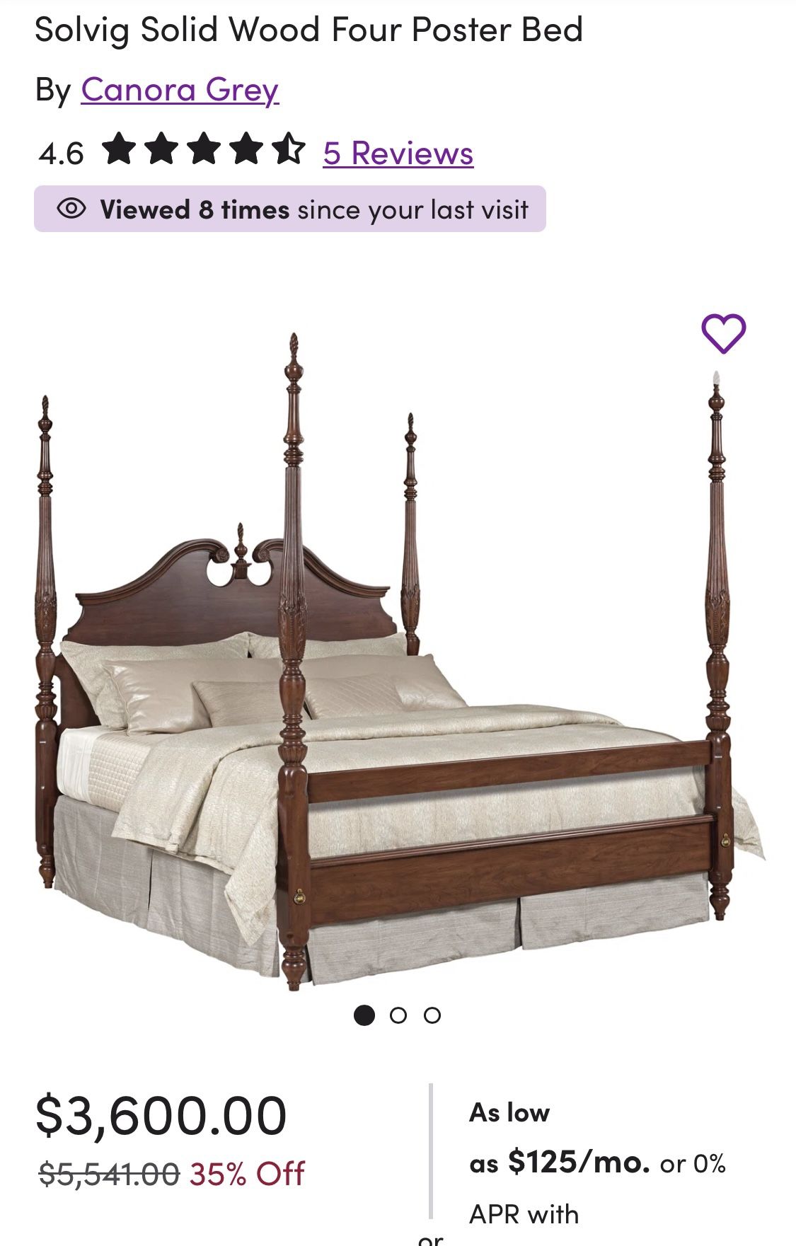 Absolutely beautiful four poster king size bed. Cherry wood. $2000. Selling at Wayfair on sale right now for $3600 (suggested retail is $5540.) See attached picture from Wayfair. If interested, will sell these with it: King Size Mattress $50 (good quality foam mattress, 6 years old, extra firm, always has been covered with a high quality water proof mattress pad/protector) Bedding $20 (comforter, 2 shams, 3 decorative pillows) Willing to negotiate.