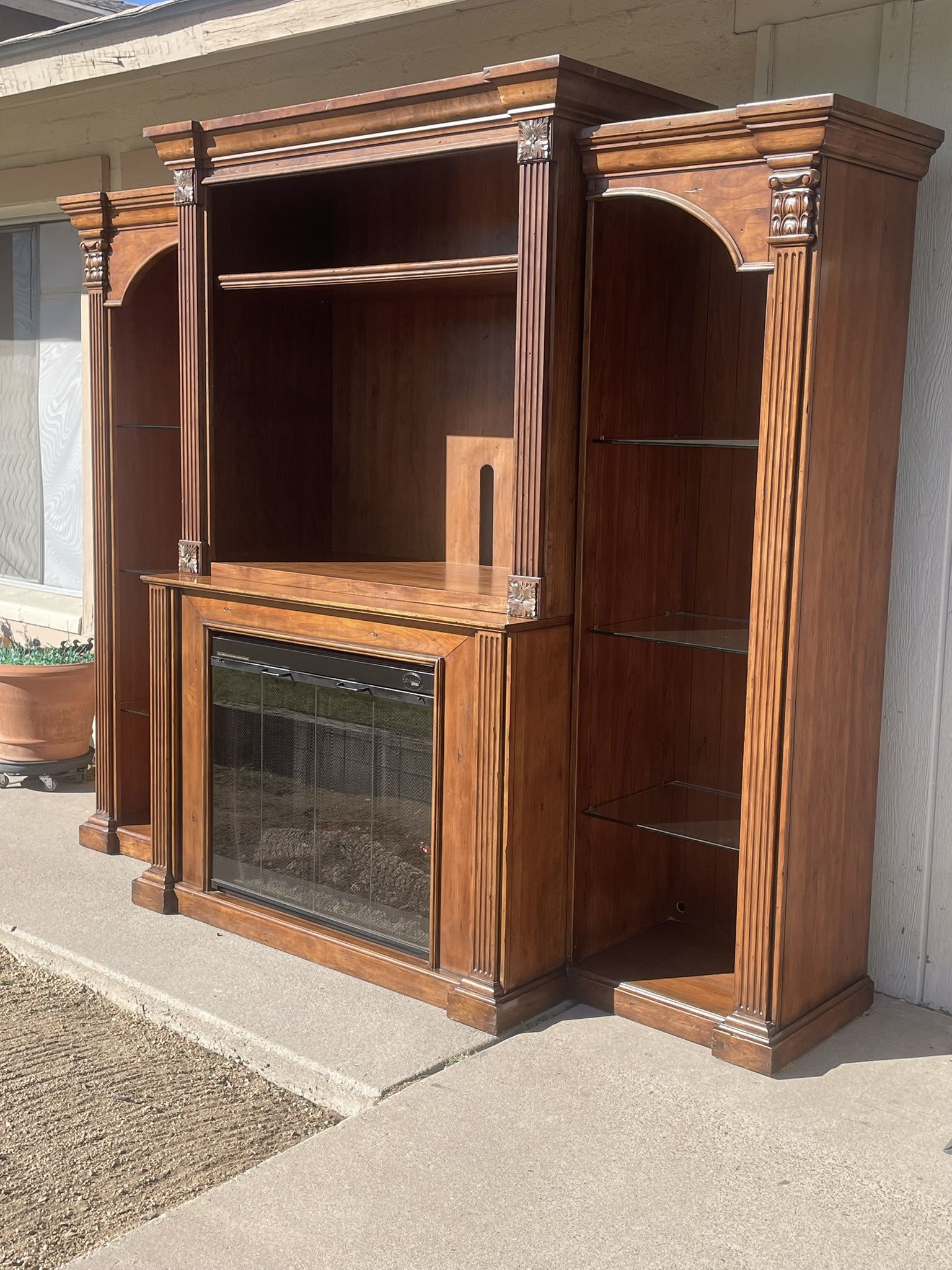 Beautiful four piece wooden tv stand entertainment center with heated fireplace, remote, booklet, lighted bookcases with grooved glass adjustable shelves. Some nicks and dings from moving (pictured). Center is 84” h x 51” w x 28” d x 23” d Bookcases 79” h x 24” w x 18” d